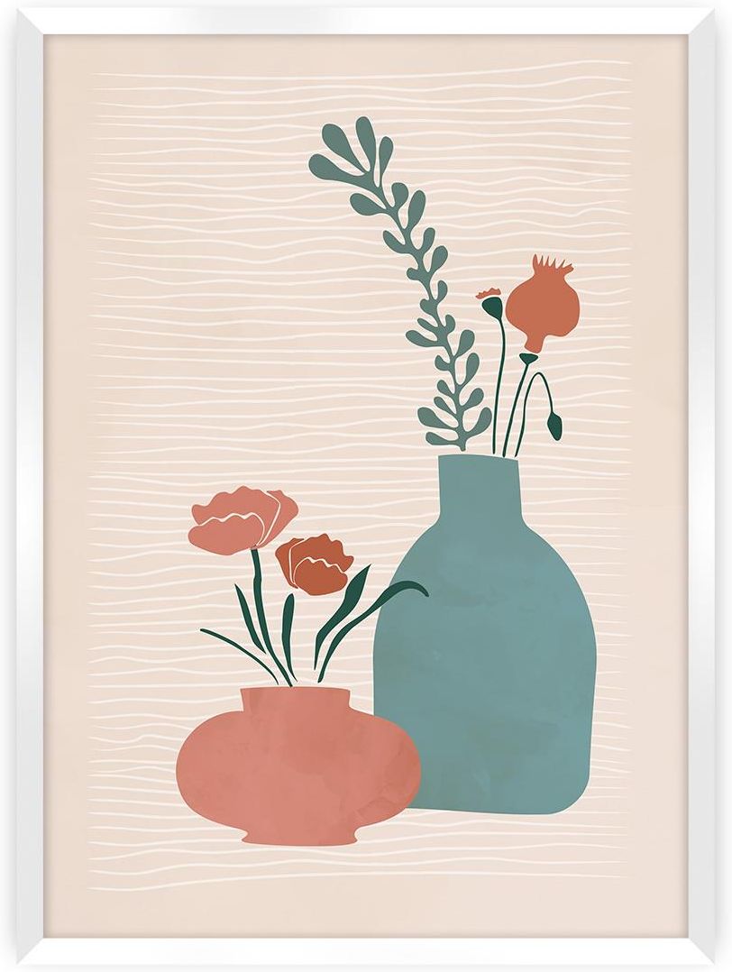 Plakat z grafiką w stylu minimalistycznym z motywem wazonów i kwiatów.Plakat Bloomline to stylowa dekoracja ścienna z grafiką przedstawiającą dwie wazony z roślinami w odcieniach terakoty, butelkowej zieleni i przygaszonego błękitu. Całość osadzona jest na jasnym, beżowym tle z delikatnym wzorem falistych linii. Ten nowoczesny motyw doskonale komponuje się z wnętrzami w stylu skandynawskim, boho oraz modern retro. Świetnie wygląda solo lub jako część większej galerii ściennej, zwłaszcza w zestawieniu z innymi grafikami o organicznych formach i zgaszonych barwach.Grafika wydrukowana została na papierze satynowym bez połysku o gramaturze 200 g.Plakat dostępny w wersji bez ramki. Dla uzyskania lepszego efektu dobierz pasującą do Twoich preferencji ramkę. Pozwoli to na stworzenie kompletnej galerii.W naszej ofercie posiadamy ramki w kolorze: białym, czarnym, srebrnym oraz złotym. Ramki dostępne są w pięciu rozmiarach: 21x30 cm, 30x40 cm, 40x50 cm i wykonane są z tworzywa sztucznego. Rozmiary 50x70 cm i 70x100 cm wykonane są z aluminium.