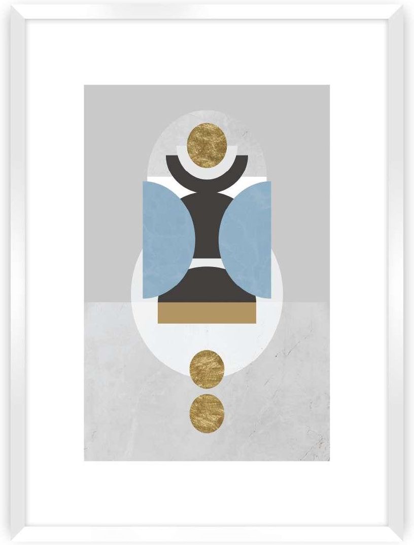 Oryginalny plakat z geometrycznymi kształtami, w odcieniach czerni, błękitu, szarości i złotego na szarym tle. Plakat został oprawiony w białą, wbudowaną ramę z passe partout.Grafika wydrukowana została na papierze satynowym bez połysku o gramaturze 200g. Plakat można kupić bez ramki, jednak dla uzyskania lepszego efektu dobierz pasującą ramkę. Pozwoli Ci to na stworzenie kompletnej galerii na ścianie. W naszej ofercie posiadamy ramki w kolorze: białym, czarnym, srebrnym i złotym.Ramki dostępne są w pięciu rozmiarach. Rozmiary 21x30cm, 30x40cm, 40x50cm wykonane są z tworzywa sztucznego. Rozmiary 50x70cm i 70x100cm wykonane są z aluminium.