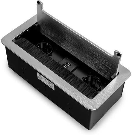 Gniazdo wpuszczane w blat otwierane Spacetronik SPS-B24S V2 z przepustem szczotkowym (srebrny) Mediaport Spacetronik ERGOLINE SPS-B24S V2 to nowoczesne rozwiązanie, które znajduje zastosowanie w sklepach, salonach sprzedaży, salach konferencyjnych, biurach, a także w domu. Na górze znajduje się pokrywa i szczotka przeciwkurzowa. Gniazdo zostało wykonane z aluminium i wysokiej jakości komponentów. Produkt jest przeznaczony do montażu wewnątrz pomieszczeń w biurkach, blatach i stołach, zarówno w pozycji pionowej, jak i poziomej, zapewniając dostęp do gniazd. Mediaport został wyposażony w 2 gniazda 110-250 V (typ Schuko) oraz podwójną ładowarkę USB. Elegancki i nowoczesny design Seria mediaportów Spacetronik wyróżnia się niebanalnym designem, który sprosta potrzebom nawet tych najbardziej wymagających użytkowników. Wykonany z dbałością o każdy detal, mediaport idealnie wkomponuje się w stanowisko pracy, wnętrze salonu sprzedaży, bądź salę konferencyjną. Łatwa instalacja Montaż gniazda blatowego otwieranego jest bardzo łatwy. 1. Wytnij otwór o odpowiednich wymiarach.2. Umieść mediaport w otworze i przykręć go. Parametry techniczne i wyposażenie - Długość kabla zasilającego: 1,5 m- Zasilanie sieciowe: 230 V 50 Hz- 2x gniazdo typu niemieckiego 110-250 V (16 A)- 1x podwójna ładowarka USB (2 A)- Wymiary puszki: 25 cm x 9,4 cm x 11,5 cm (szer./wys./gł.)- Wymiary zewnętrzne : 13 cm x 26,5 cm- Sugerowane wymiaru otworu w blacie: 25,3 cm x 11,7 cm