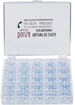 Przybornik na 25 szpulek, przezroczysty. Wygodny, zamykany pojemnik wraz z 25 szpulkami na nici. Pasuje do większości maszyn firm : Łucznik - 466, 451, 432, 415.... Elna - 220, 240, 320, 340, 520, 720, .... Juki - HZL 12, 29, 353, 355, 357, HD 40, 80, 197, G 110, 210, F 300, 400, 600. Brother - BQ17, KD144, BN27, RH127, HF27, HF37, NV-15,20.27.35.55.1100,1300,1800...... Janome -1015, 920, 1019, 415, 419, 423, 60507, 393, 525, 601, 603, 605, 607, 5060, 6100.... Przy zakupie prosimy wpisać w uwagach do jakiej maszyny potrzebne są szpulki, ponieważ jest ich wiele rodzajów i niektóre są bardzo podobne a mogą nie pasować.