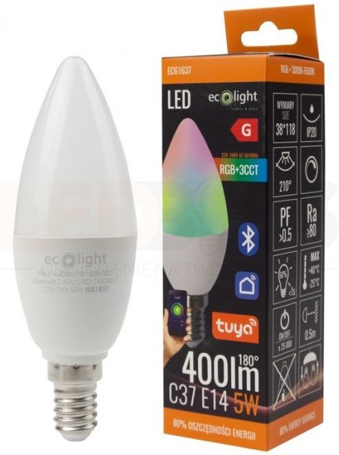 Żarówka LED E14 C37 5W 400lm RGB+CCT Tuya Smart Bluetooth Eco Light EC61637 Żarówka LED C37 5W RGB+CCT Tuya Smart Bluetooth Inteligentna żarówka LED C37 5W z gwintem E14 , sterowana z aplikacji w systemie Tuya Smart przez Bluetooth. Pozwala ustawić dowolny kolor RGB oraz regulować barwę białą CCT …