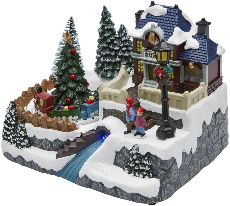 Świąteczna wioska z poruszającym się pociągiem. Odtwarzanie muzyki (opcjonalne). Zasilanie trzema bateriami AA (do kupienia osobno).