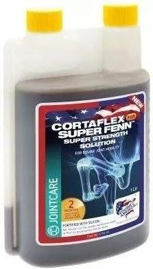 Cortaflex HA Super Fenn Super Strength Solution 1l - nowy skład (wzmocniony kadzidłowcem oraz jukką) Cortaflex to numer jeden wśród preparatów na stawy. Ponad 2 miliony sprzedanych butelek! Cortaflex dostarcza substancje odżywcze do stawów oraz stymuluje je do produkcji płynu stawowego. Cortaflex HA Super Fenn Super Strength jest znanym z bardzo wysokiej skuteczności chondroprotetykiem (preparatem na stawy), został dodatkowo wzmocniony kadzidłowcem (Boswellia Serrata) oraz jukką (Jukka) aby dodatkowo działać przeciwbólowo. W swoim składzie zawiera bardzo dobrze przyswajalny niskocząsteczkowy kwas hialuronowy, który migruje bezpośrednio z przewodu pokarmowego do stawów. W odróżnieniu od wysokocząsteczkowego kwasu HA nie jest metabolizowany przez wątrobę. W składzie Cortaflexu HA Super Fenn Super Strength znajdziemy również kolagen oraz metylosulfonylometan (MSM). Cortaflex HA Super Fenn Super Strength jest z powodzeniem stosowany w weterynarii jako kontynuacja po iniekcjach z kwasu HA oraz jako profesjonalna profilaktyka w przypadku koni wyczynowych. Składniki w dawce 30 ml MSM 2500mg kolagen 1120mg mangan 50mg kwas hialuronowy 40mg miedź 25mg krzem 10mg witamina B6 7.5mg kadzidłowiec 450mg kwas glutaminowy 269mg glicyna 291mg Analiza wilgotność 70,76%, surowe białko 8,0%, włókno surowe <1,0%, oleje surowe <1,0%, popiół surowy <1,0%, sód <1,0%, kwas glutaminowy 0,9% Dodatki (na kg) Dodatki odżywcze: witaminy witamina B6 (3a831)250 mg. Pierwiastki śladowe mangan (3b504 Aminokwasowy chelat manganowy, hydrat) 1660 mg, miedź (3b414 Glicynowy chelat miedzi(II), hydrat) 800 mg. Dodatki sensoryczne 2b kadzidłowiec (Boswellia Serrata) 15000mg, 2b jukka (Yucca Schidigera) 16,5 mg, 2 b17034 glicyna 7000 mg Skład woda, drożdże, metylosulfonylometan (MSM) (8,3%), kolagen (3,75%), kwas hialuronowy (0,14%), bambus (0,133%). Dawkowanie Konie 500kg ciężko pracujące oraz nadmiernie obciążające stawy 30 ml dziennie z paszą lub bezpośrednio do pyska. Pozostałe konie oraz dla utrzymania efektów 15 ml dziennie. Pozostałe konie adekwatnie do wagi. Maksymalna dzienna dawka 30 ml. Zapas na 2 m-ce