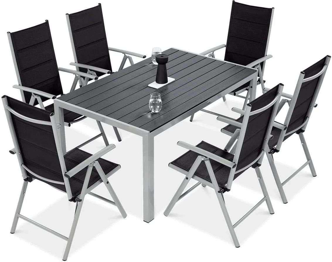 Zestaw ogrodowy Sydney Silver obejmuje prostokątny stół o wymiarach 150 cm długości, 90 cm szerokości oraz 72 cm wysokości oraz sześć krzeseł mierzących 56 cm szerokości, 67 cm głębokości oraz 107 cm wysokości. Prezentowany komplet ze stalowym stelażem w srebrnym kolorze koresponduje z czarnym siedziskiem tekstylnym oraz blatem z deski kompozytowej. Wygodna krzesła posiadają 7-stopniową regulację, która pozwala dostosowywać wysokość oparcia do indywidualnych potrzeb oraz miękkie siedzisko, które nie wymaga dodatkowych poduszek. Zestaw ogrodowy Sydney przeznaczony dla sześciu osób jest odporny na szkodliwe działanie czynników atmosferycznych.