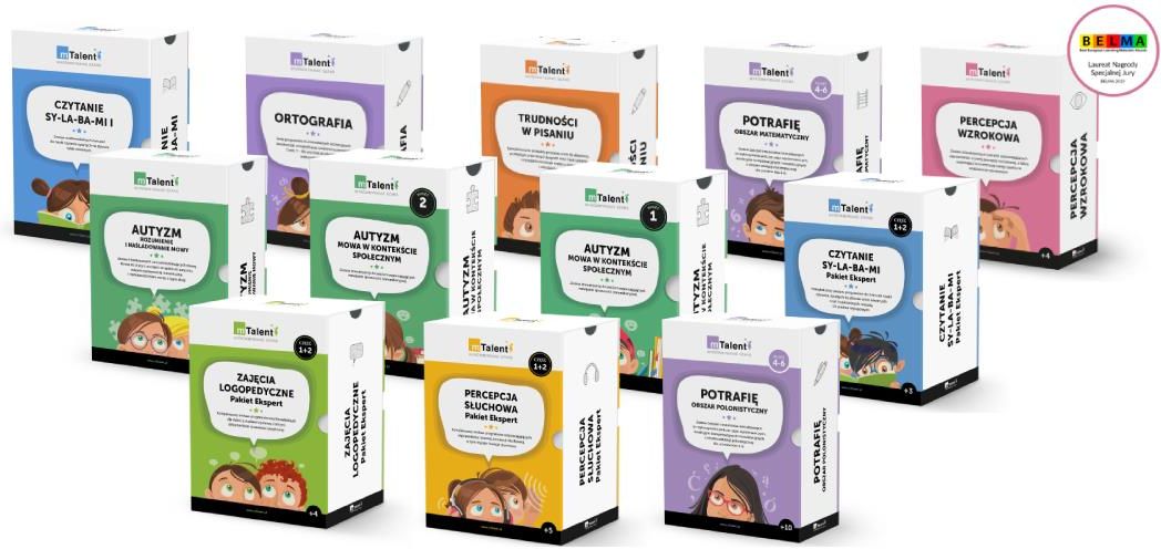 mTalent Zajęcia logopedyczne pakiet Ekspert - link Program multimedialny dla dzieci z wadami wymowy i innymi zaburzeniami sprawności językowej. 3400 ćwiczeń interaktywnych oraz - blisko 800 kart pracy do wydruku. wyposażenie dodatkowe szkolenie online z obsługi programu program LOGO-ZABAWNIK zestaw drukowanych kart pracy mTalent Percepcja słuchowa Pakiet Ekspert - link Zestawy ćwiczeń w programie zostały zaprojektowane tak, aby odzwierciedlały kryteria zawarte w definicji ośrodkowego zaburzenia przetwarzania słuchowego (CAPD) stworzonej przez Amerykańskie Towarzystwo Mowy i Słuchu (ASHA, 1996). Program może być wykorzystany podczas zajęć tradycyjnych oraz tych na odległość - oprogramowanie mTalent – jako jedyne rozwiązanie na polskim rynku – umożliwia pracę zdalną, w tym wideokonferencje, bez konieczności korzystania z zewnętrznego oprogramowania. Jest to wyjątkowo bezpieczne rozwiązanie – szczególnie dla najmłodszych dzieci Praca z programem możliwa jest zarówno online (z dowolnego miejsca i urządzenia z dostępem do Internetu) jak i offline (w placówce, gabinecie). Został przygotowany w nowoczesnej technologii HTML5, co oznacza, że posłuży użytkownikom przez wiele lat. mTalent Percepcja wzrokowa - link Zestaw interaktywnych ćwiczeń wspomagających usprawnianie i rozwój percepcji wzrokowej, a także wspierający koncentrację uwagi opartą na analizatorze wzrokowym. Laureat prestiżowej nagrody BELMA 2019 Do wykorzystania na zajęciach korekcyjno-kompensacyjnych, rewalidacyjnych, dydaktyczno-wyrównawczych i innych mających na celu kształtowanie i usprawnianie percepcji wzrokowej, Ponad 600 ekranów interaktywnych oraz zestaw materiałów dodatkowych, Dla terapeutów i nauczycieli zajmujących się wspomaganiem sprawności w zakresie percepcji wzrokowej (np. dzieci z grupy ryzyka dysleksji) Dzięki swojej zawartości i zastosowaniu specjalnych rozwiązań graficzno-funkcjonalnych, program świetnie nadaje się do pracy z dziećmi z dezintegracją sensoryczną, z dysleksją lub ryzykiem dysleksji, dziećmi nadpobudliwych psychoruchowo, mających kłopoty z koncentracją i koordynacją wzrokowo-ruchową mTalent Ortografia - link Seria programów multimedialnych kształcących świadomość ortograficzną i poprawną pisownię Do wykorzystania na zajęciach dydaktycznych, dydaktyczno-wyrównawczych, zajęciach terapii pedagogicznej i innych mających na celu wspomaganie nauki poprawnej pisowni i zasad ortograficznych Blisko 1200 ekranów interaktywnych oraz zestaw materiałów dodatkowych Produkt dla nauczycieli przedszkola, rodziców i pedagogów zajmujących się wspomaganiem rozwoju oraz podnoszeniem sprawności umiejętności poprawnej pisowni u dzieci mTalent Trudności w pisaniu - link Specjalistyczny produkt przeznaczony do diagnozy, profilaktyki i terapii dysgrafii oraz nauki pisania i rozwijania motoryki małej u dzieci i młodzieży. Do wykorzystania na zajęciach korekcyjno-kompensacyjnych, rewalidacyjnych i dydaktyczno-wyrównawczych z dziećmi ze specyficznymi trudnościami w uczeniu się (w tym z symptomami dysgrafii lub obniżonym napięciem mięśniowym) narzędzie profilaktyczne przygotowujące dzieci do nauki pisania, wspomagające tradycyjną naukę pisania liter Blisko 1000 ekranów interaktywnych oraz zestaw materiałów dodatkowych Produkt dla terapeutów pedagogicznych i nauczycieli zajmujących się wspomaganiem sprawności w zakresie motoryki i umiejętności pisania mTalent. Czytanie SY-LA-BA-MI cz.1 i 2 - link Pakiet dwóch programów przeznaczonych dla dzieci w wieku 3+ oraz 5+ , zawierający zestaw multimedialnych ćwiczeń do nauki czytania opartych na zbiorze sylab otwartych oraz ćwiczeń inspirowanych metodą 18 struktur wyrazowych. Multimedialna pomoc i uatrakcyjnienie w nauce czytania, które doskonale wspiera proces zarówno skutecznej nauki czytania, jak i postępowania terapeutycznego w tym obszarze. Do wykorzystania na zajęciach dydaktycznych, dydaktyczno-wyrównawczych, logopedycznych, zajęciach terapii pedagogicznej i innych mających na celu wspomaganie nauki czytania Łącznie w dwóch zestawach około 900 ekranów interaktywnych oraz zestaw materiałów dodatkowych Produkt dla nauczycieli przedszkola, rodziców, logopedów i pedagogów zajmujących się wspomaganiem rozwoju oraz podnoszeniem sprawności umiejętności czytania u dzieci mTalent Autyzm. Rozumienie i naśladowanie mowy - link Zestaw interaktywnych ćwiczeń do pracy z uczniami ze spektrum autyzmu, a także niepełnosprawnością intelektualną i innymi problemami komunikacyjnymi. Do wykorzystania na zajęciach rewalidacyjnych, terapeutycznych i dydaktycznych prowadzonych indywidualnie lub w małych grupach ponad 1500 ekranów interaktywnych, karty pracy, przewodniki metodyczne oraz zestaw dodatkowych pomocy i publikacji autorskich Dla terapeutów pracujących z uczniami ze spektrum autyzmu, niepełnosprawnością intelektualną i innymi problemami komunikacyjnymi mTalent Potrafię. Obszar matematyczne (klasy 4-6) - link Zestaw ćwiczeń i materiałów interaktywnych do wykorzystania podczas zajęć wyrównawczych, korekcyjno-kompensacyjnych i rewalidacyjnych z obszaru edukacji polonistycznej dla uczniów klas 4-6. Ćwiczenia wspomagające i rozwijające umiejętności arytmetyczne, kształtujące umiejętności myślenia i jasnego formułowania wniosków, przygotowujące uczniów do wykorzystania wiedzy matematycznej w rozwiązywaniu problemów z życia codziennego i doskonalące wiele umiejętności z innych ważnych obszarów Blisko 600 niepowtarzalnych, zróżnicowanych ekranów, które aktywizują ucznia, rozwijają zdolności samokształcenia, pomagają pokonać ewentualne trudności w nauce Produkt przeznaczony do wykorzystania podczas zajęć wyrównawczych, korekcyjno-kompensacyjnych i rewalidacyjnych z obszaru edukacji matematycznej dla uczniów klas 4-6 mTalent Potrafię. Obszar polonistyczny (klasy 4-6) - link Zestaw 