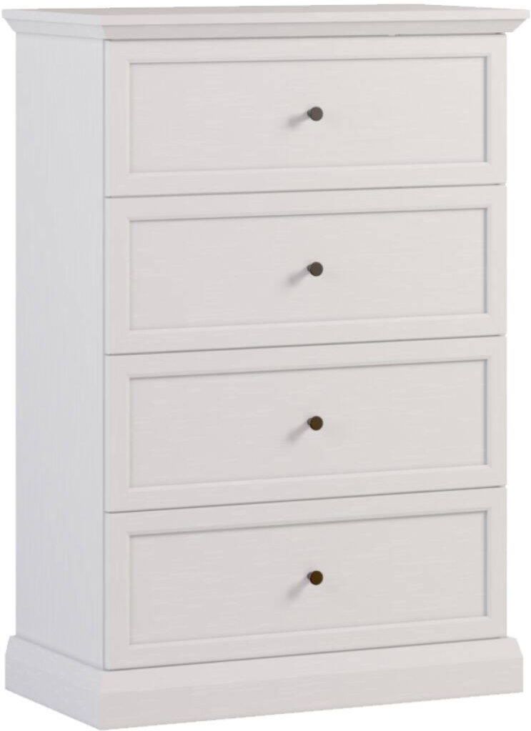Komoda Lucca K4S w kolorach Biały Opal i Dąb Craft doskonale łączy elegancję z funkcjonalnością. Cztery pojemne szuflady na metalowych prowadnicach zapewniają mnóstwo miejsca do przechowywania. Solidne wykonanie z płyty laminowanej i MDF, metalowe uchwyty