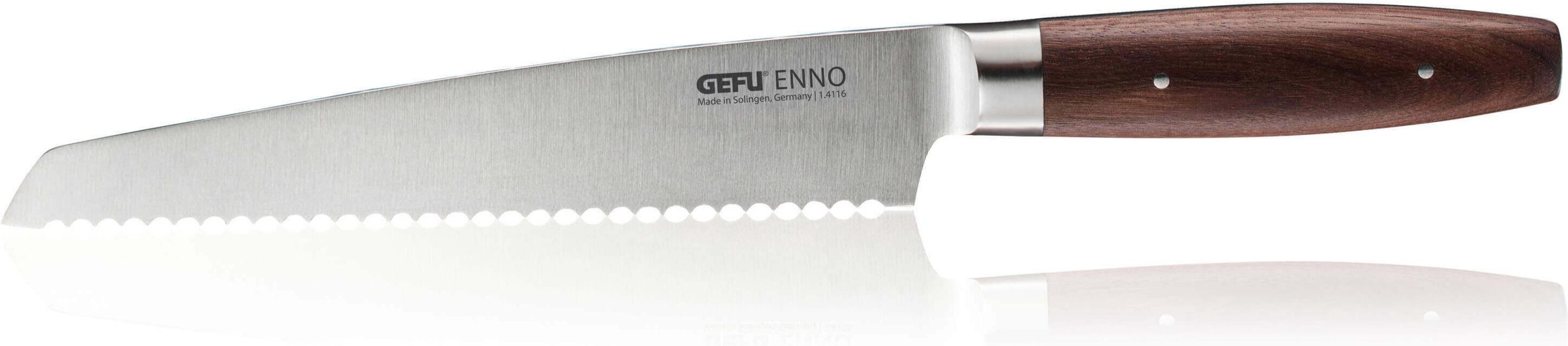 Nóż do pieczywa ENNO o dł. ostrza 21 cm. Wykonany z ręcznie szlifowanej niemieckiej stali nierdzewnej i orzecha włoskiego. Rustykalny, elegancki design.