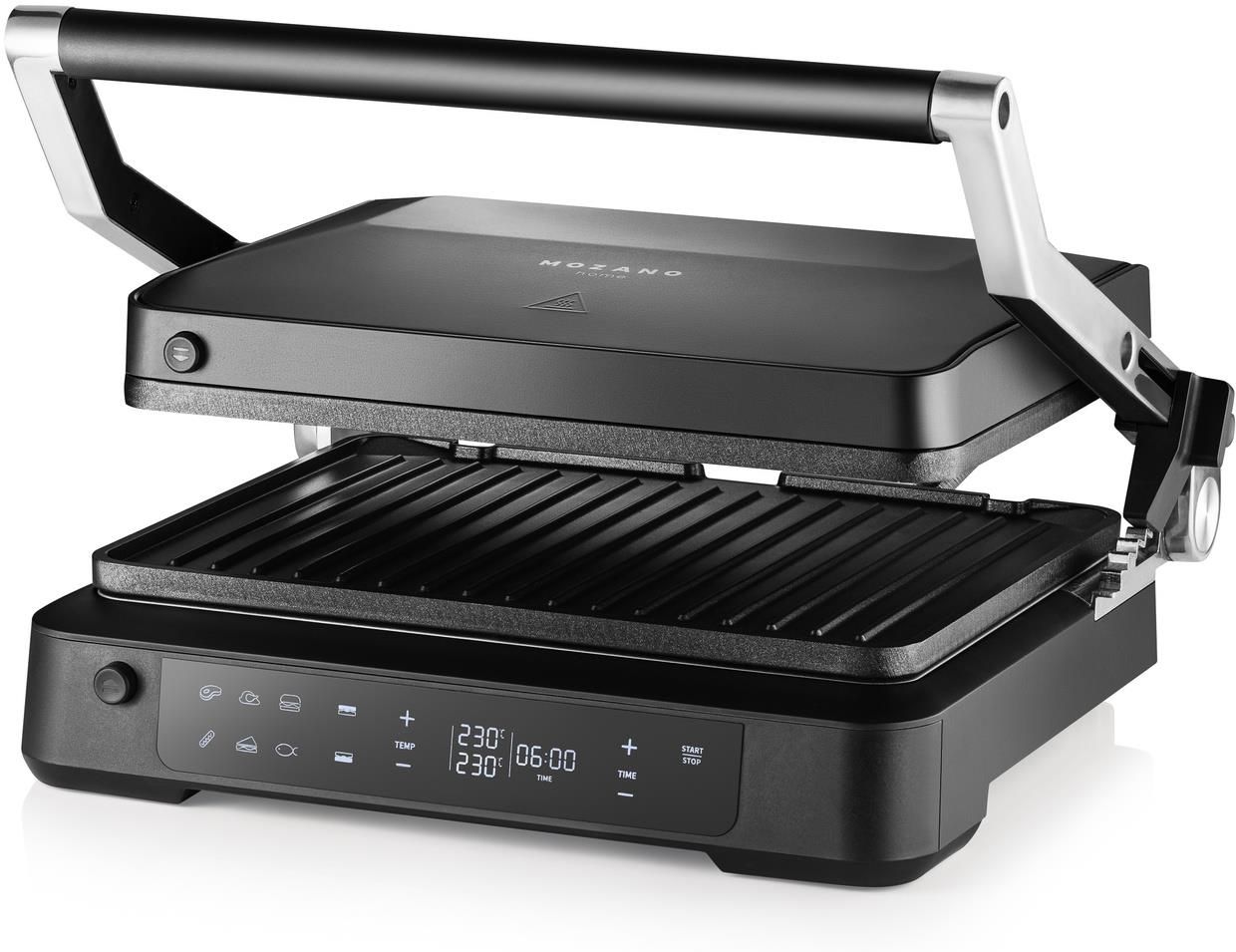 Wielofunkcyjny Grill Elektryczny Mozano Dual Cook – perfekcyjne grillowanie przez cały rok! ▶ Grill i opiekacz w jednym – idealny do mięsa, warzyw, panini i nie tylko ▶ Niezależna regulacja temperatury – osobne ustawienia dla górnej i dolnej płyty ▶ Szeroki zakres temperatur – od 80°C do 230°C, pełna kontrola nad grillowaniem ▶ 6 automatycznych programów – idealne ustawienia dla różnych potraw ▶ Timer aż do 90 minut – wygodne grillowanie bez konieczności stałego kontrolowania ▶ Wyjmowane płyty grzewcze – łatwe czyszczenie ▶ Tacka ociekowa – zbiera nadmiar tłuszczu i soków ▶ Możliwość otwarcia na płasko (grillowanie otwarte) – większa powierzchnia grillowania ▶ Regulowana wysokość górnej płyty - 5 pozycji opiekania – elastyczne dostosowanie nacisku górnej płyty ⭐⭐⭐⭐⭐ Funkcjonalność, wygoda i smak – wszystko w jednym urządzeniu! Precyzyjna kontrola temperatury – dwa niezależne termostaty Poznaj sekret idealnego grillowania dzięki Dual Cook wyposażonemu w dwa niezależne termostaty dla górnej i dolnej płyty grzewczej. Teraz możesz oddzielnie ustawiać temperaturę od 80°C do aż 230°C, co zapewnia perfekcyjne przygotowanie różnych potraw w tym samym czasie. Chrupiące warzywa, soczyste mięsa, delikatne ryby – każda potrawa wymaga własnych warunków termicznych, a Ty masz nad nimi pełną kontrolę. Dwa termostaty – pełna niezależność grzania góry i dołu. Szeroki zakres temperatur (80°C – 230°C) – idealny do różnych technik kulinarnych, od delikatnego opiekania po intensywne grillowanie. Łatwa obsługa i precyzja – szybko i bezpiecznie dostosujesz ustawienia do aktualnych potrzeb. Ciesz się perfekcyjnymi rezultatami grillowania na co dzień! Panel dotykowy – pełna kontrola jednym dotknięciem Grill Mozano Dual Cook został wyposażony w nowoczesny, dotykowy panel sterowania, dzięki któremu przygotowanie potraw staje się prostsze i przyjemniejsze: Intuicyjne ikony automatycznych programów - Wybierz jeden z 6 zaprogramowanych trybów: Stek w 4 wariatach wysmażenia, Kurczak, Buerger, Kiełbasa, Kanapka lub Ryba Precyzyjna regulacja temperatury obu płyt - Wybierz dla której płyty ustalasz temperaturę, a następnie ją dostosuj do swoich potrzeb przyciskami „+” / „–” Timer - Ustaw czas pracy urządzenia w dokładnych minutach. Grill automatyczne wyłączy się po zakończeniu cyklu Funkcja Start/Stop - Szybki start, zatrzymanie lub pauza pracy w dowolnym momencie Czytelny wyświetlacz - Wyraźne informacje o aktualnej temperaturze i pozostałym czasie. Przejrzysty układ graficzny gwarantujący komfort obsługi Ergonomiczna rączka wykonana z materiału termoodpornego pozostaje chłodna nawet po długotrwałym grillowaniu, zapewniając pewny, bezpieczny chwyt i maksymalny komfort obsługi bez potrzeby używania dodatkowych rękawic. Automatyczne grillowanie Grill Dual Cook został wyposażony w wygodne programy, które automatycznie dobierają temperaturę oraz czas grillowania. Wystarczy wybrać ikonę odpowiadającej potrawy, aby urządzenie samo ustawiło optymalne parametry. Stek wołowy w 4 wariantach - Grill rozgrzeje płyty do 230 °C, a czas smażenia dobierze do Twoich preferencji: 3 minuty dla średnio krwistego, 4 minuty dla średnio wysmażonego, 6 minut dla dobrze wysmażonego i aż 8 minut, gdy wolisz bardziej wysmażone mięso. Kurczak - działa w temperaturze 220 °C przez 7 minut. To doskonały wybór, gdy chcesz uzyskać złocistą skórkę i soczyste wnętrze piersi czy udek, bez konieczności kontrolowania każdej sekundy smażenia. Hamburger - Dla miłośników domowych burgerów przewidziano ustawienie 230 °C na 6 minut. Mięso dzięki temu zabiegowi szybko się zarumieni, zachowując wewnątrz pełnię aromatów i soków. Kiełbasa - Jeśli planujesz szybkie grillowanie kiełbasy, program ustawi 220 °C na 10 minut. W efekcie skórka stanie się chrupiąca, a wnętrze miękkie i równomiernie podgrzane. Kanapka - Ikona kanapki aktywuje 220 °C na 5 minut – idealne do przygotowania panini z serem, warzywami i ulubionymi dodatkami. Efekt to lekko przyrumieniony chleb i miękki, roztopiony środek. Ryba - Program „Ryba” pracuje w niższej temperaturze 210 °C przez 8 minut, chroniąc delikatne filety przed przesuszeniem, jednocześnie nadając im subtelny, grillowany aromat. Dzięki tym programom przygotujesz potrawy w optymalnych warunkach, bez konieczności ręcznego ustawiania parametrów. Po zakończeniu cyklu grill automatycznie wyłączy podgrzewanie, a Ty zyskasz perfekcyjnie przyrządzone danie! Regulacja wysokości górnej płyty Grill elektryczny Dual Cook został zaprojektowany z myślą o maksymalnej wszechstronności i komforcie użytkowania. Zaawansowany mechanizm pozwala na płynną, pięciostopniową regulację wysokości górnej płyty, dzięki czemu z łatwością dopasujesz odległość między płytami do grubości nawet najbardziej wymagających składników – od cienkich plasterków bakłażana, przez soczyste steki, aż po grube kanapki czy panini. Każdy poziom nastaw możesz precyzyjnie blokować. Wygoda użytkowania i łatwe czyszczenie Zdejmowane płyty Grill elektryczny został wyposażony w praktyczne, zdejmowane płyty, które znacznie ułatwiają utrzymanie urządzenia w czystości. Po zakończonym grillowaniu wystarczy odpiąć płytę i szybko umyć ją pod bieżącą wodą. Nieprzywierająca powłoka Specjalna, wysokiej jakości nieprzywierająca powłoka zapobiega przywieraniu potraw, dzięki czemu nie musisz używać tłuszczu, a Twoje dania pozostaną lekkie i zdrowe. Powierzchnia płyt równomiernie rozprowadza ciepło, co gwarantuje idealne przypieczenie każdego kawałka mięsa, ryby czy warzyw. Pełne otwarcie do 180° Co więcej, konstrukcja zawiasu umożliwia całkowite otwarcie urządzenia do płaskiej pozycji 180°, zamieniając grill w rozległą płytę grzewczą. Dzięki temu zyskuj