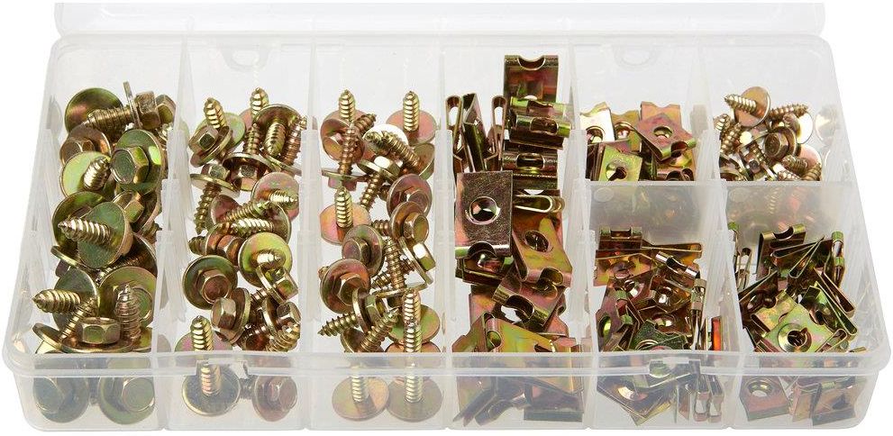 Ocynkowane wkręty samochodowe (DIN 7976) z podkładkami (DIN6903) i spinkami metalowymi. W zestawie: Wkręty z podkładką 20 szt. 4,2 x 13 mm 20 szt. 4,8 x 16 mm 20 szt. 5,5 x 16 mm 20 szt. 6,3 x 16 mm Spinki metalowe 20 szt. 11 x 16,5 x 0,6 mm 20 szt. 11 x 16,2 x 0,5 mm 20 szt. 11,8 x 17,5 x 0,43 mm 20 szt. 15 x 26 x 0,7 mm Zestaw dostarczany w praktycznym pojemniku z przegródkami. Stal ocynkowana Wkręty z pasującymi podkładkami Spinki metalowe w czterech rozmiarach