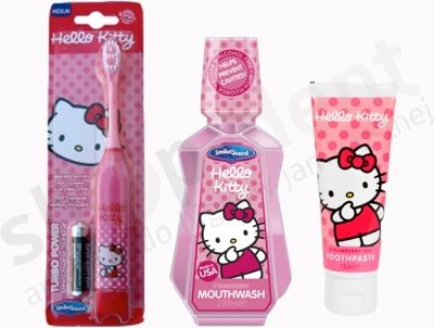 NOWOŚĆ!!! zestaw dla dzieci Hello Kitty! Pasta+płyn+szczoteczka Specjalnie skomponowany z okazji Dnia Dziecka zestaw, z jedną z ulubionych postaci dziecięcych- Hello Kitty.W zestawie znajduje się płyn do płukania jamy ustnej dla dzieci powyżej 6 roku życia, truskawkowa pasta do zębów w żelu oraz szczoteczka elektryczna na baterie.Poniżej opisy produktów: Elektryczna szczoteczka na baterie Hello Kitty zasilana bateryjnie elektryczna szczoteczka obrotowa dla dzieci.zaprojektowana tak, by czyścić dokładniej niż manualne szczoteczki do zębów i docierać w trudno dostępne miejsca. Wygodna w użyciu szczoteczka z atrakcyjnym wizerunkiem postaci Hello Kitty, ma za zadanie zachęcić dzieci do mycia zębów.Szczoteczka jest przenośna i może być używana również poza domem. Nie należy jej zanurzać w wodzie, co może spowodować uszkodzenia.Cechy:Wymagana jest 1 bateria "aa" (w zestawie)Dzieci do lat 3 mogą korzystać ze szczoteczki wyłącznie pod nadzorem dorosłych.Nie należy używać akumulatorów. Płyn do plukania jamy ustnej HELLO KITTY dla dzieci powyżej 6 roku życia - smak gumy balonowej Hello Kitty to jedna z najbardziej popularnych postaci wśród najmłodszych. Produkty z tą postacią zaprojektowane są tak, by zachęcić dzieci do mycia zębów oraz wykształcić prawidłowe nawyki jeśli chodzi o higienę jamy ustnej. Płyn do płukania jamy ustnej Hello Kitty to bezalkoholowy płyn o smaku gumy balonowej. Nie zawiera cukru, dzięki czemu jest bezpieczny dla zębów. zawiera fluor, co działa remineralizująco i zapobiega próchnicy.zalecany jest dla dzieci powyżej 6 roku życia. Należy napełnić zakrętkę, płukać jamę ustną jej zawartością przez 30 sekund, a następnie wypluć. Skład: Aqua, Sorbitol, Propylene Glycol, Xylitol, Sodium Benzoate, Sodium Fluoride, Sucralose, Cetylpyridinium Chloride, Polysorbate 80, Poloxamer 407 NF, Aroma – Bubble Gum Flavour – 3030, Sodium Phosphate, Disodium Phosphate, Disodium EDTA, Citric Acid, Menthol, +/- CI 17200 Pasta do zębów dla dzieci w żelu Hello Kitty - smak truskawkowy Hello Kitty to jedna z najbardziej popularnych postaci wśród najmłodszych. Produkty z tą postacią zaprojektowane są tak, by zachęcić dzieci do mycia zębów oraz wykształcić prawidłowe nawyki jeśli chodzi o higienę jamy ustnej. Pasta do mycia zębów Hello Kitty została stworzona, by chronić dziecięce zęby przed powstawaniem próchnicy, dbać o zdrowie ich dziąseł oraz wzmacniać i remineralizować szkliwo. Jej przyjemny truskawkowy smak to kolejna zaleta, która na pewno zostanie w pamięci dziecka.Skład: Sorbitol , Hydrated Silica , PEG-32 , Aqua , Sodium Lauryl Sulfate , Cellulose Gum , Parfum , CI 77891 , Sodium Fluoride , Sodium Saccharin , Trisodium Phosphate , CI 73360 , Contains 0.32% w/w Sodium Fluoride (1450 ppm F).
