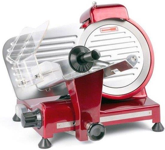 Aluminiowa krajalnica Profi Line do wędlin i mięsa o średnicy noża 22 cm. Nóż wykonany ze stali nierdzewnej ustawiony skośnie. Obudowa w kolorze czerwonym. Silnik chłodzony powietrzem z zabezpieczeniem przed przegrzaniem. Wózek z osłoną zabezpieczającą, elementem dociskającym i pionową blokadą. Możliwość szybkiego i łatwego demontażu w celu czyszczenia. Krajalnica bezpieczna w użytkowaniu: ustawienie pokrętła na grubość krojenia „0” utrzymuje ostrze za jego osłoną ochrona przed uruchomieniem przy zdemontowanej ostrzałce lub zdjętej osłonie ostrza możliwość zablokowania i zdemontowania wózka tylko przy ostrzu ustawionym w pozycji „0” grubości Uwaga: Krajalnica tylko do krojenia wędlin i mięs - nie do żółtego sera.