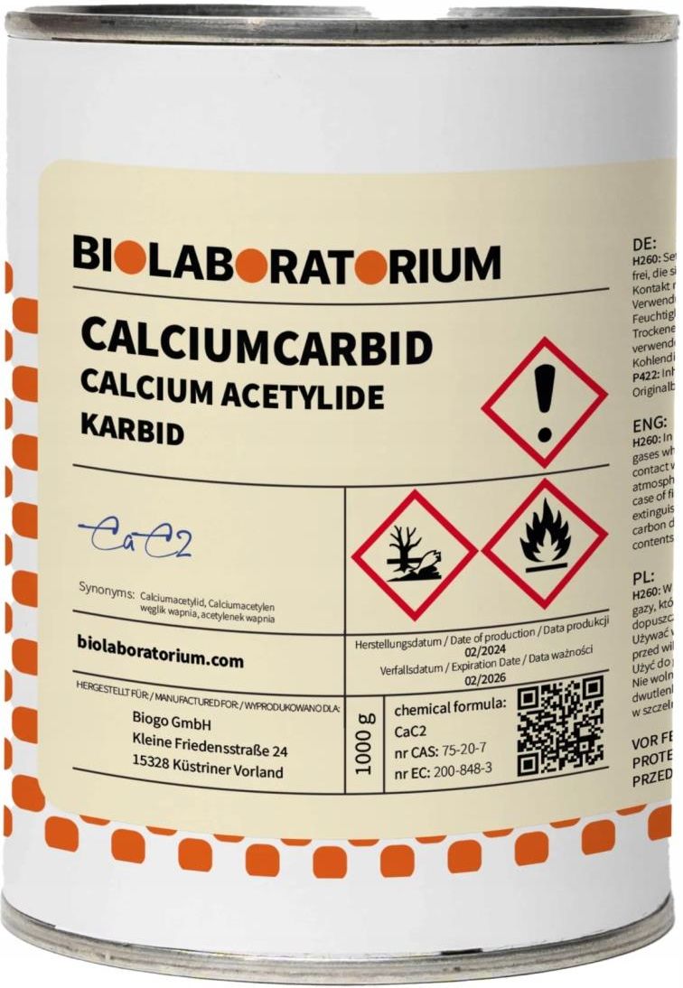 Karbid wapnia BIOLABORATORIUM 5 kg Węglik wapnia BIOLABORATORIUM 5 kg Informacje techniczne na temat odczynników chemicznych Wzór chemiczny: CaC2 Numer CAS: 75-20-7 Numer WE: 200-848-3 Przykłady zastosowań profesjonalnych w różnych branżach Przemysł chemiczny - Produkcja acetylenu: Węglik wapnia (CaC₂) jest stosowany w przemyśle chemicznym do produkcji acetylenu, ważnego materiału wyjściowego w wielu syntezach chemicznych oraz jako gaz palny w technologii spawalniczej. Przemysł stalowy - Odsiarczanie stali: W przemyśle stalowym do odsiarczania stali stosuje się węglik wapnia. Reaguje z siarką tworząc związki wapnia i siarki, które można łatwo usunąć, poprawiając jakość stali. Rolnictwo - Przyspieszanie dojrzewania owoców: Węglik wapnia jest stosowany w rolnictwie w celu przyspieszenia dojrzewania owoców, takich jak banany i mango. Uwolniony acetylen działa jak gaz dojrzewający. Badania i rozwój - Eksperymenty i badania: Węglik wapnia jest stosowany w laboratoriach do różnych eksperymentów i badań chemicznych, szczególnie w badaniach nad acetylenem i innymi reakcjami chemicznymi. Ostrzeżenia na etykiecie produktu H260: W kontakcie z wodą uwalniają się łatwopalne gazy, które mogą ulec samozapłonowi. P222: Nie dopuszczać do kontaktu z powietrzem. P231+P232: Przechowywać w atmosferze gazu ochronnego, w suchym miejscu. P370+P378: W przypadku pożaru: stosować piasek, suche środki gaśnicze. Nie używać wody. P422: Przechowywać zawartość/pojemnik w szczelnie zamkniętym, suchym pojemniku. Zalecane warunki przechowywania Produkty takie jak karbid należy przechowywać w suchym miejscu, z dala od wilgoci i innych substancji chemicznych. Ponadto należy unikać przechowywania w miejscach narażonych na działanie wysokich temperatur. Zaleca się ponadto przechowywanie węglika w miejscu dobrze wentylowanym, z dala od ognia i innych źródeł ciepła. Produkty chemiczne należy przechowywać zgodnie z przepisami bezpieczeństwa i instrukcjami producenta. Oznaczenia na opakowaniu Producent: Kategoria: Waga z opakowaniem: 0 kg
