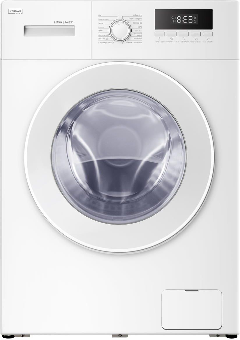 Pralka Kernau Basic BKFWM I 6402 W 6kg Eco-Logic Slim 16 Programów Pralka Kernau BKFWM I 6402 W to funkcjonalne urządzenie z ładowaniem od frontu, stworzone z myślą o wygodzie codziennego prania. Dzięki pojemności 6 kg, silnikowi indukcyjnemu oraz prędkości wirowania 1000 obr./min zapewnia skuteczność i oszczędność. Oferuje 16 programów, w tym pranie antyalergiczne, wstępne, dodatkowe płukanie i czyszczenie bębna. Funkcje takie jak opóźnienie startu, wskaźnik czasu do końca cyklu i kontrola piany zwiększają komfort użytkowania. System antywypływowy i zabezpieczenie przed przegrzaniem dbają o Twoje bezpieczeństwo. To doskonały wybór dla osób ceniących niezawodność i prostotę obsługi. NAJWAŻNIEJSZE PARAMETRY Klasa energetyczna: B Kolor: Biały Maksymalny załadunek: 6kg Prędkość wirowania: 1000 obr/min Pojemność bębna: 39L Liczba programów: 16 Sterowanie: Przyciski + pokrętło System anty-wypływowy Blokada rodzicielska Wskaźnik blokady drzwi Pranie antyalergiczne Kontrola ilości piany Wyświetlacz LED Opóźnienie startu Wysokość: 85 cm Szerokość: 60 cm Głębokość: 45 cm Czyszczenie bębna Funkcja czyszczenia bębna pomaga utrzymać wnętrze pralki w higienicznej czystości, usuwając resztki detergentu i bakterie. Regularne uruchamianie tego programu wydłuża żywotność urządzenia i zapewnia świeżość prania. 16 Programów Pralka oferuje aż 16 zróżnicowanych programów, dostosowanych do różnych typów tkanin i stopnia zabrudzenia. Dzięki temu łatwo dopasujesz cykl do codziennych potrzeb – od delikatnych tkanin po intensywne pranie. 1000 obr/min Maksymalna prędkość wirowania 1000 obr./min skutecznie usuwa wodę z tkanin, skracając czas suszenia. To idealne rozwiązanie dla osób, które chcą szybko cieszyć się świeżym praniem. Kontrola ilości piany Zaawansowany czujnik monitoruje poziom piany w bębnie i automatycznie dostosowuje cykl płukania. Dzięki temu ubrania są dokładnie wypłukane, a nadmiar detergentu nie podrażnia skóry. SPECYFIKACJA TECHNICZNA Informacje podstawowe Kolor: Biały Ładowanie: Od frontu Dane techniczne Prędkość wirowania: 1000 obr/min Pojemność bębna: 39L Maksymalny załadunek: 6 kg Silnik: Indukcyjny Sterowanie: Przyciski + pokrętło Liczba programów: 16 Średnica otworu wsadowego: 308 mm Drzwi standardowe: Tak Bezpieczeństwo System anty-wypływowy: Tak Blokada rodzicielska: Tak Wskaźnik blokady drzwi: Tak Wskaźnik blokady rodzicielskiej: Tak Zabezpieczenie przed przegrzaniem: Tak Dodatkowe funkcje Pranie antyalergiczne: Tak Kontrola ilości piany: Tak System kontroli wyważenia wsadu: Tak Wyświetlacz LED: Tak Wskaźnik pozostałego czasu prania: Tak Wybór prędkości wirowania: Tak Wybór temperatury prania: Tak Opóźnienie startu: Tak Dodatkowe płukanie: Tak Czyszczenie bębna: Tak Programy Bawełna: Tak Eco 40-60°C: Tak Wełna: Tak Antyalergiczne: Tak Delikatne: Tak Mix: Tak Koszule: Tak Szybki 15': Tak Pościel: Tak +pranie wstępne (samo pranie wstępne): Tak (Eco) 20°: Tak Płukanie: Tak Wirowanie: Tak Ubrania sportowe: Tak Intensywne: Tak Czyszczenie bębna: Tak Parametry techniczne Klasa efektywności energetycznej: B Klasa efektywności wirowania: C Poziom emisji hałasu (db): 76 dB Klasa emisji hałasu (A, B, C, D): B Zużycie energii na 100 cykli (kWH): 48 kWH Napięcie zasilania / częstotliwość prądu (V/Hz): 220 - 240 / 50Hz Całkowity pobór prądu (A): 10 Ciśnienie wody (Mpa): Maksymalne: 1, minimalne: 0,1 Moc całkowita (W): 1850 W Wymiary Wymiary (S x G x W): 600 x 450 x 850 mm Waga netto: 50 kg