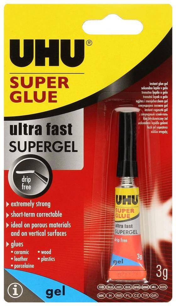 Klej Super Glue Gel GEL Ultra Fast Control 3 g UHU Bardzo szybki i silny klej błyskawiczny, dociera do najmniejszych zakamarków i połączeń. Idealny do klejenia małych powierzchni (nie nadaje się do klejenia dużych powierzchni). Klei wiele tworzyw sztucznych, takich jak: sztywne PVC (polichlorek …