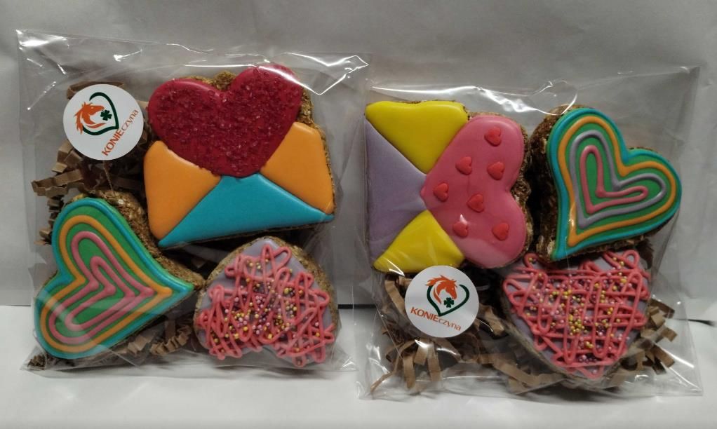 Zestaw walentynkowy stworzony z myślą o wyjątkowych wierzchowcach. Skład: marchewki, płatki owsiane, otręby owsiane, mąka pszenna, mąka kukurydziana, siemię lniane, miód, sól Dekoracje: cukier barwiony/ posypka cukrowa, lukier Zdjęcie poglądowe, otrzymany produkt może się nieznacznie różnić od tego na zdjęciu Ciastka nie podlegają reklamacjom/zwrotom-mimo odpowiednich zabezpieczeń ciastko może ulec uszkodzeniu w trakcie transportu