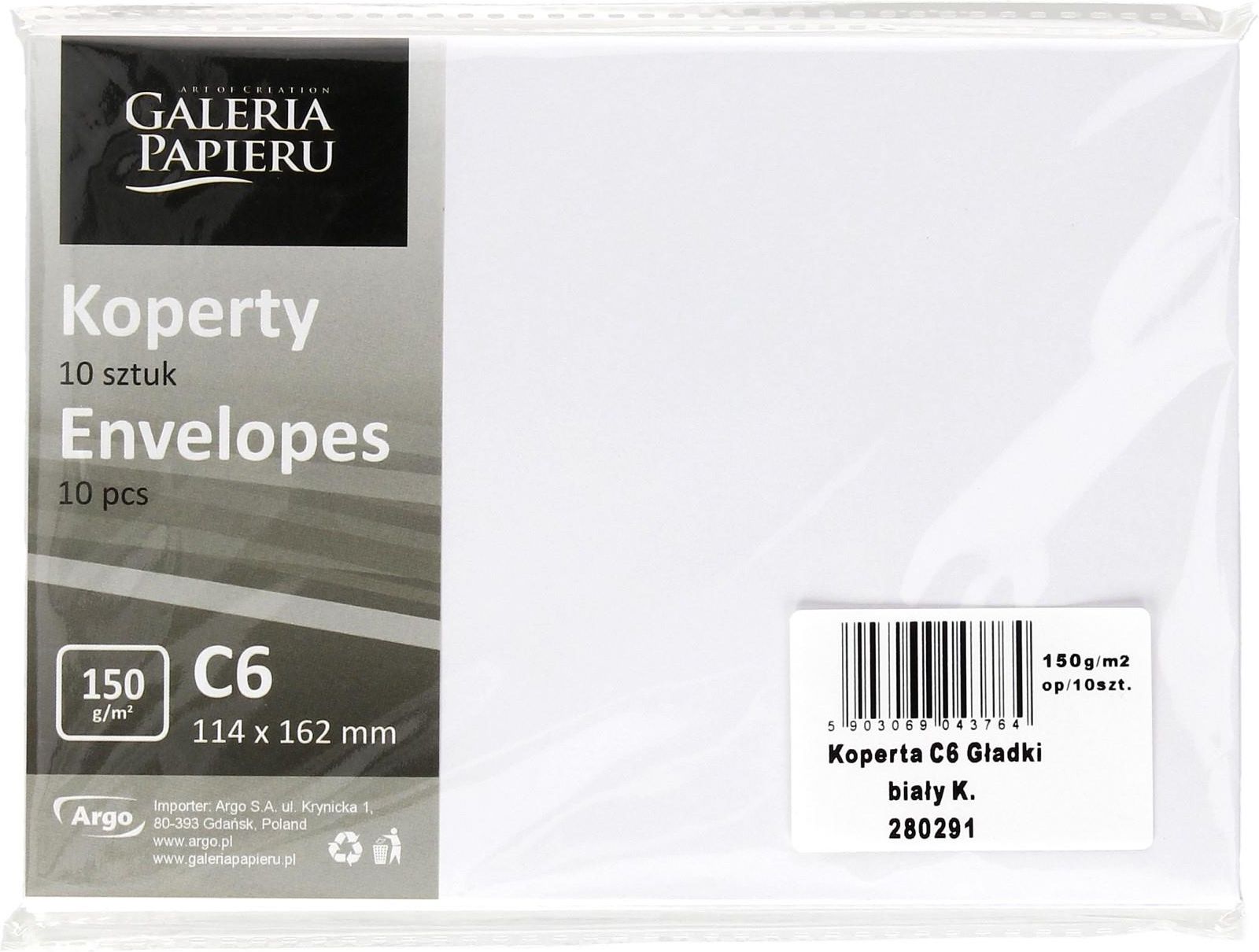 Białe koperty C6 marki Galeria Papieru. Wykonane z wysokiej jakości papieru, idealnie nadają się np. na zaproszenia. Wykonane z papieru gładkiego Gramatura papieru: 150g/m2 Wymiary: 114 mm x 162 mm Format: C6 Ilość w opakowaniu: 10 szt. Kolor: biały koperty klejone na mokro