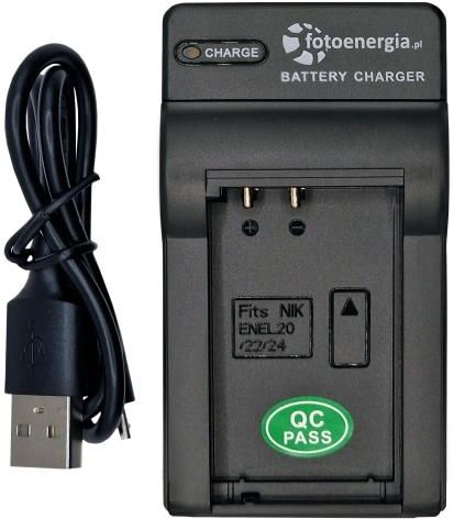 Ładowarka współpracuje z akumulatorami: NIKON: EN-EL20, ENEL20, EN-EL22, EN-EL24, ENEL22, ENEL24 Specyfikacja: Ładowanie jest sterowane mikroprocesorem, co zapewnia długą pracę akumulatora. Długość ładowania wynosi od 1,5 do 2,5 godziny, w zależności od pojemności akumulatora. Diody sygnalizujące ładowanie/naładowanie. Ładuje wysokim (ale bezpiecznym) prądem impulsowym 500mA, akumulatory o dowolnej pojemności (nawet 10 000mAh). Trwała i estetyczna. Bardzo lekka - waży ok. 70g. Wymiary: 4,8 x 8,4 x 2,2 cm Gwarancja: 12 miesięcy Kod produktu: 24248 Urządzenie zasilane jest z gniazda USB. Dzięki temu możliwe jest ładowanie z laptopa, power banka, ładowarki od smartfona oraz w samochodzie. Opis produktu Procesorowa ładowarka marki fotoenergia.pl jest bardzo szybka i wygodna. Umożliwia ładowanie dedykowanych akumulatorków. Działa w pełni automatycznie, sygnalizuje stan pracy i jest w pełni bezpieczna. Bezpieczeństwo: Automatycznie rozpoczyna i kończy ładowanie - nie trzeba jej pilnować. Rozpoznaje polaryzację. Posiada zabezpieczenia przed przegrzaniem lub przeładowaniem akumulatora. Bardzo niska awaryjność. Certyfikat Rohs, Ce. Pasujące akumulatory z modeli aparatów: Nikon: 1 AW, 1 J, 1 J2, 1J3, 1 S, 1 V3, CoolPix A, CoolPix P1000, CoolPix P950, DL24-500 f/2.8-5.6,Blackmagic Pocket Cinema Camera, Coolpix A, Coolpix P1000, Nikon 1 S1, Nikon 1 J1, Nikon 1 J2, Nikon 1 J3, Nikon 1 V3, Nikon 1 AW1, Nikon DL24-500 W zestawie Ładowarka Kabel USB Oryginalne opakowanie