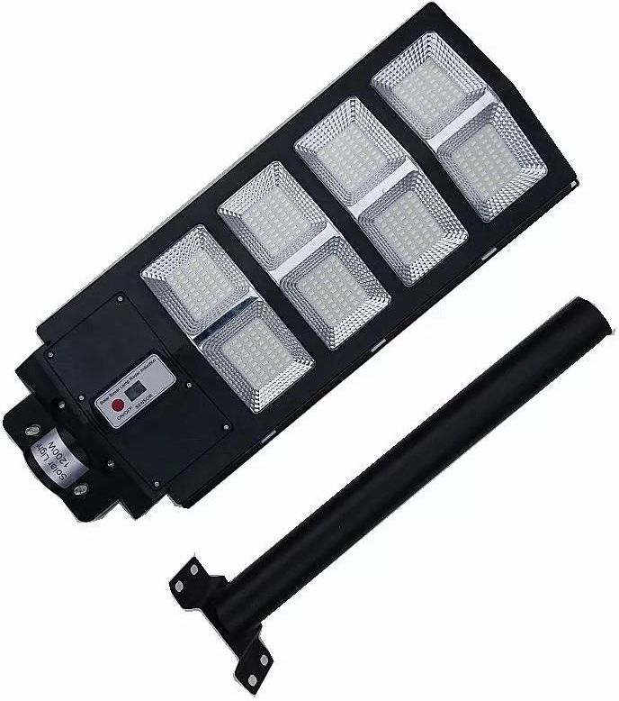 Latarnia uliczna solarna 360 mocnych LED SMD 1200W IP65, posiada wbudowany czujnik ruchu i zmierzchu, W zestawie panel słoneczny, pilot sterujący i mocowanie do słupka lub ściany fi50. Lampa ma kilka trybów pracy: timer, włączenie na stałe i automatyczny - po wykryciu ruchu zapala światło. Wszystkie rodzaje pracy są powtarzalne i działają po zmroku. Lampa solarna świeci dzięki energii słonecznej. Tym samym, jest nie tylko niezawodna i bezpieczna, ale także tania w użytkowaniu. Aby zwiększyć jej możliwości, została wyposażona w czujniki zmierzchu i ruchu oraz pilot pozwalający na zdalne sterowanie. Kompaktowe rozmiary sprawiają, że lampa uliczna idealnie sprawdza się podczas oświetlania obszarów wokół domu – zwłaszcza podjazdów i ogródków. Brak kabli oraz pełna regulacja uchwytu znacząco zwiększają możliwości jej zastosowania, gdyż wymaga jedynie niezadaszonego miejsca. Aby działać po zmroku, musi naładować się za pomocą promieni słonecznych. Detekcja ruchu + kontrola światła: lampa solarna ma wbudowany czujnik ruchu i kontrolę zmierzchu, aby automatycznie regulować światło (włączyć o zmierzchu, wyłączyć o świcie), po wykryciu ruchu, Ten model latarni solarnej posiada możliwość demontażu panela, wymiany baterii lub dokonania innych napraw. Nie jest to normą w tego typu konstrukcjach. Pilot posiada standardowe funcie dla tego typu urządzeń czyli on/off, timer i radar. Lampa potwierdza przyjęcie polecenia mignięciem. Pilot nie jest dedykowany do konkretnej lampy, więc można kilka latarni obsługiwać jednym pilotem. Pilotem można wybrać tryb zimowy lub letni, wybrać tryb stałego światła lub wykrywania radaru, wybrać 3,5,8 godzin, aby regularnie włączać tryb radaru. ON/OFF przełączkin Timer 3h Wyłącza latarnie po 2 godzinach ciągłego świecenia Timer 5h Wyłącza latarnię po 4 godzinach ciągłego świecenia Timer 8h Wyłącza latarnię po 6 godzinach ciągłego świecenia Radar induction Przycisk włączający czujnik ruchu i funkcję świecenia w 100% kiedy ktoś nadchodzi Latarnia solarna jest mocowana do rury o średnicy fi 50 (rura do mocowania w komplecie) Specyfikacja: Panel solarny: 6V/18W Akumulator: 3,7V 20000mAh obszar: do 200m2 Kąt wykrywania: 120 stopni Zasięg wykrywania:8-12 metrów Zalecana wysokość montażu: 3-8M Czas ładowania: 5-6h - zależy od nasłonecznienia, Czas świecenia: 5-10h - zależny od ilości aktywacji i trybu pracy. Czas pracy: do 3 dni w trybie wykrywania ruchu, latarnia o mocy: 1200W, Diody led: 360LED, Lumen: Max 10000LM, wymiary lampy: 630mm * 70mm * 250mm, Rozmiar panelu słonecznego: 250*590mm, funkcja Auto on/off, czujnik ruchu typu PIR. Zastosowanie: ogród, garaż uliczny, ścieżka, taras przy basenie, podwórko Uwaga: bateria pilota zdalnego sterowania powinna być alkaliczna. Cechy: Możliwość demontażu panela słonecznego w celu wymiany baterii lub wykonania innych prac serwisowych. ładowanie akumulatora z panelu solarnego, łatwy montaż, brak przyłącza elektrycznego, diody led zasilane energią odnawialną, bateria wysokiej klasy o dużej pojemności, korpus z tworzywa sztucznego ABS zabezpieczony przed opadami deszczu. Zestaw zawiera: Latarnię solarną 1200w z wbudowanym akumulatorem i panelem słonecznym, Pilota zdalnego sterowania, Mocowanie typu rura fi 50mm Oświetlenie zewnętrzne wokół domu zwiększa nasze bezpieczeństwo po zmroku – nie musimy obawiać się potknięcia o schody czy inne wystające elementy. Lampa solarna sprawdzi się w każdym miejscu, gdzie po zachodzie słońca widoczność jest znacznie ograniczona.