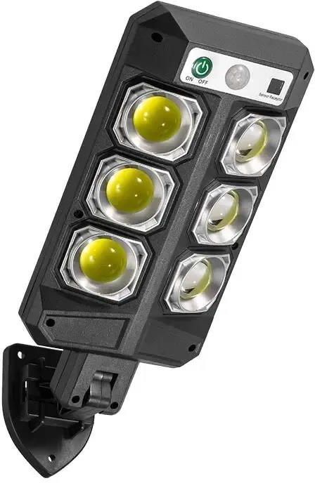 Sterowana pilotem, lampa latarnia uliczna ogrodowa o mocy 10w i 6 modułach COB(42led), z czujnikiem ruchu i zmierzchu oraz pilotem zdalnego sterowania zasilanie akumulatorowe ładowanie słoneczne ip 65 kolor czarny. Lampa solarna ścienna led z 6 modułami led COB z 3 trybami pracy, posiada pilota zdalnego sterowania oraz czujnik ruchu i zmierzchu, IP65 jest wodoodporna. Lampa słoneczna idealna przed dom, do oświetlenia drzwi wejściowych, furtki, ściany domu itp. Moduły led COB mają znacznie lepszą wydajność w porównaniu do tradycyjnych diod. Cechy Wydajna lampa solarna z diodami LED umieszczonymi w 6 modułach COB z wbudowanym panelem słonecznym to niewyczerpane źródło darmowej energii dla Twojego domu. Zamontuj ją w dowolnym miejscu. Zredukuj koszty oświetlenia zewnętrznego, stawiając przy tym na ekologię - brak konieczności wymiany baterii. Dzięki wbudowanemu czujnikowi ruchu i zmierzchu będzie zapalać się wyłącznie w nocy i tylko wtedy, gdy lampa wykryje wokół siebie ruch. Specyfikacja produktu Typ: 6COB, Panel słoneczny: 3.69W, moduły cob: 6 sztuk, Kąt ruchu: 270 stopni, Akumulator litowo-jonowy: 1500mAh, Odległość ruchu: 5M. Wymiary latarni: 165 x 45 x 437 mm Pilot posiada standardowe funcie dla tego typu urządzeń czyli on/off i wybór trybu pracy. Pilot nie jest dedykowany do konkretnej lampy, więc można obsługiwać kilkareflektorów jednym pilotem. ON - Włącz OFF - Wyłącz mode 1: lampa zapali się pełnym światłem po wykryciu ruch i zgaśnie po 25 sekundach. mode 2: latarnia świeci 10% mocy, po wykryciu ruchu zapali się na 100% i powróci do 10% po 25 sekundach. mode 3: lampa świeci na 30% mocy od zmierzchu do świtu lub wyczerpania baterii. Tryby pracy lampy - działają po zmroku Tryb 1: 100% mocy, gdy wykryje ruch i wyłączy się po około 20 sekundach Tryb 2: 100% mocy, gdy wykryje ruch i 10% mocy po około 20 sekundach Tryb 3: to 20% przez 5 godzin. Lampa jest łatwa w obsłudze i instalacji. Zestaw zawiera lampę ścienną, z wbudowaną baterią, czujnikiem ruchu i panelem słonecznym, pilot zdalnego sterowania, uchwyt do mocowania na ścianie, kołeczki rozporowe do mocowania lampy i śrubki do uchwytu.