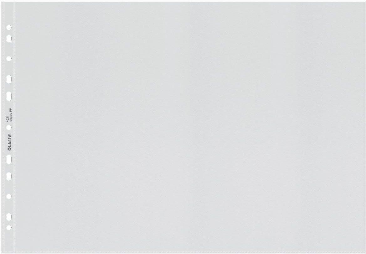 Koszulki Leitz Recycle A3 100 mic | 25 sztuk. Przyciągające wzrok, najwyższej jakości koszulki na dokumenty A3 przeznaczone są do porządkowania dokumentów w biurze i w domu oraz ich ochrony podczas przenoszenia. Koszulki posiadają perforowany pasek, który służy do wpinania do segregatorów z mechanizmem dźwigniowym oraz ringowych. Wykonane z plastiku w 90% pochodzącego z recyklingu (przedkonsumpcyjnego), audytowane zewnętrznie i certyfikowane przez UL, neutralne dla klimatu dzięki redukcji emisji i kompensacji CO2. W 100% nadają się do ponownego przetworzenia. Te wytrzymałe, praktyczne koszulki z matowej folii groszkowej zapewniają użytkowanie przez długie lata i doskonale pasują do innych produktów z kolekcji Leitz Recycle. Kolekcja nowoczesnych, przyjaznych dla środowiska artykułów biurowych świetnie zaprezentuje się w domu i w biurze. Dzięki przyjaznej dla środowiska linii produktów Recycle oferowanej przez firmę Leitz masz wpływ na poprawę zarówno środowiska biurowego, jak i całej naszej planety. Wykonane z plastiku w 90% pochodzącego z recyklingu (przedkonsumpcyjnego), audytowane zewnętrznie i certyfikowane przez UL, neutralne dla klimatu dzięki redukcji emisji i kompensacji CO2 . W 100% nadają się do ponownego przetworzenia. Ochronne plastikowe koszulki A3 do przechowywania i archiwizacji dokumentów w większych formatach: map, planów architektonicznych, rysunków kreślarskich i innych materiałów. Najwyższej jakości wytrzymałe i nietoksyczne tworzywo sztuczne (polipropylen) gwarantuje możliwość wielokrotnego użytku. Uniwersalny, perforowany, wzmocniony pasek z 11 otworami pasuje do każdego segregatora dźwigniowego i ringowego; wykonany jest z przezroczystej folii pochodzącej z recyklingu. Najwyższej jakości matowa folia groszkowa o grubości 100 mikronów. Folia copy safe zapobiega migracji tuszu z papieru na plastik. Bezkwasowy materiał zapobiega żółknięciu papieru z upływem czasu, idealny do długotrwałej archiwizacji ważnych dokumentów. Wyprodukowana w Europie. Opakowanie z plastiku pochodzącego z recyklingu i wkładka z papieru pochodzącego w 100% z recyklingu.
