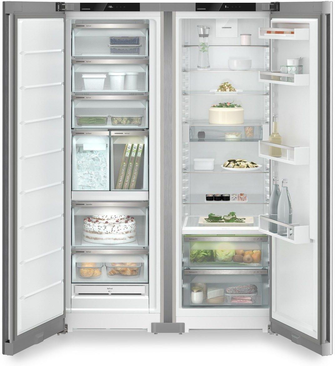 XRFsf 5245 Plus BioFresh NoFrost Zestaw Side-by-Side Wymiary zewnętrzne: wysokość / szerokość / głębokość: 1.855 / 1.226 / 675 mm Pojemność całkowita: 659 l Sposób połączenia z siecią: Możliwość doposażenia SFNsfd 5247 Plus NoFrost - Zamrażarka wolnostojąca z NoFrost i IceTower Wymiary zewnętrzne: wysokość / szerokość / głębokość: 185,5 / 59,7 / 67,5 cm Pojemność całkowita: 277 l + SRBsfc 5220 Plus BioFresh - Chłodziarka wolnostojąca z systemem BioFresh. Wymiary zewnętrzne: wysokość / szerokość / głębokość: 185,5 / 59,7 / 67,5 cm Pojemność całkowita: 382 l Fruit & Vegetable-Safe Krucha sałata lub truskawki: najbardziej delikatne artykuły spożywcze zasługują na specjalne miejsce, aby mogły pozostać dłużej świeże: komory BioFresh-Safe. W pojemniku „Fruit & Vegetable-Safe” temperatura jest bliska 0°C. W połączeniu z panującą tam stale wilgotnością powietrza, dzięki szczelnemu zamknięciu, niezapakowane owoce i warzywa czują się tam szczególnie dobrze. Nie ma potrzeby ustawiania czegokolwiek. Meat & Dairy-Safe Chcesz zachować jak najdłużej świeżość delikatnego filetu jagnięcego lub świeżego mleka? Do tego służą komory BioFresh-Safe: W pojemniku „Meat & Dairy-Safe” panuje temperatura bliska 0°C – idealne warunki przechowywania także dla najdelikatniejszych artykułów spożywczych. I najlepsze: wszystko jest ustawione fabrycznie, aby można było od razu rozpocząć korzystanie – w celu zachowania dłuższej świeżości. NoFrost Otwierając zamrażalnik, chcemy widzieć zamrożone produkty, z pewnością nie lód i szron. NoFrost chroni zamrażalnik przed niepożądanym oblodzeniem, które zużywa wiele energii i jest w związku z tym drogie. NoFrost oznacza: nigdy więcej żmudnego i czasochłonnego rozmrażania zamrażalnika, więcej czasu na inne rzeczy i oszczędzanie pieniędzy. Możliwość doposażenia w moduł SmartDeviceBox Chcesz przygotować się na przyszłość Smart Home? Twoja lodówka Liebherr chętnie Ci w tym pomoże: możesz doposażyć ją w moduł SmartDeviceBox, który umożliwia korzystanie z internetu. Moduł SmartDeviceBox można bardzo łatwo zainstalować i otwiera on już dziś przed użytkownikami cały świat cyfrowych możliwości. SteelFinish Lubisz stylową elegancję w kuchni? W takim razie wybierz lodówkę Liebherr o powierzchni SteelFinish. Materiał wykonany z kolaminatu i szczotkowany pionowo jest optycznie bardzo podobny do stali szlachetnej, odporny i łatwy w czyszczeniu. Lakierowane w kolorze srebrnym ścianki boczne perfekcyjnie uzupełniają elegancki wygląd. Wyświetlacz dotykowy Naprawdę poruszające: za pomocą wyświetlacza dotykowego można łatwo i intuicyjnie obsługiwać urządzenia Liebherr. Na wyświetlaczu są prezentowane w przejrzysty sposób wszystkie funkcje. Za pomocą lekkiego dotknięcia palcem można wybierać na przykład bez problemu funkcje lub też sprawdzać aktualną temperaturę w lodówce. IceTower IceTower z zapasem kostek lodu 8 kg sprawia, że na Twojej imprezie nigdy nie zabraknie zimnych drinków. Łopatka do kostek lodu i wysuwana półka na szynach teleskopowych zapewniają wygodny dostęp do kostek lodu. Dodatkowa miska pozwala na przechowywanie mniejszej ilości lodu i umieszczenie poniżej mrożonek. Szuflada z boku zapewnia przestrzeń do przechowywania produktów głęboko mrożonych. Łopatka do kostek lodu Porcjowanie czy transportowanie – łopatka do kostek lodu Liebherr ułatwia obie czynności. Ukośny kształt końcówki i ergonomiczny uchwyt sprawiają, że kostki lodu szybko i niezawodnie trafiają z pojemnika IceTower do drinków. Odporna łopatka ze stabilnego tworzywa sztucznego przyciąga wzrok swoją satynowaną powierzchnią w kolorze przezroczystej zieleni lodowcowej. EasyOpen Znasz to? Po schowaniu zakupów do zamrażarki zauważasz, że został na zewnątrz jakiś produkt – aby ponownie otworzyć drzwi, musisz je mocno pociągnąć. W urządzeniu Liebherr nie ma już takiej konieczności: funkcja EasyOpen pozwala wielokrotnie, łatwo i wygodnie otwierać drzwi za każdym razem. Wpuszczany uchwyt Innowacyjne i funkcjonalne: Pionowo i ergonomicznie wpuszczany uchwyt ułatwia wygodne otwieranie urządzenia. Dodatkowo nowoczesne i purystyczne wzornictwo umożliwia perfekcyjną integrację urządzenia w kuchni bez uchwytów. InteriorFit Purystyczna estetyka Twojej kuchni w pełnej okazałości: Nasze lodówki idealnie pasują do wnęki o głębokości 60 cm. Wystają jedynie drzwi, zapewniając optymalny dostęp do wpuszczanego uchwytu i klamki. Twoja kuchnia zawsze w centrum uwagi – z lodówką Liebherr jako główną atrakcją. PowerCooling-System Chcesz mieć w przypadku lodówki pewność, że zimno jest prawie równomiernie rozprowadzane? To właśnie zapewnia PowerCooling-System: wydajny, a zarazem cichy wentylator rozprowadza zimne powietrze w efektywny sposób w całej lodówce. Konstrukcja cokołowa Twoja chłodziarka ma być wydajna i wygodna, a zarazem przyjazna dla środowiska? W takim razie urządzenie Liebherr jest wprost stworzone dla Ciebie. Nasza technologia BluPerformance zapewnia bowiem wielką wszechstronność: oferuje wyjątkowo dużą przestrzeń i moc chłodniczą, zużywa jednak przy tym niezwykle mało energii. I posłuchaj: prawie niczego nie usłyszysz. Urządzenia Liebherr mimo swojej mocy pracują bowiem wyjątkowo cicho. Silent Co chcesz słyszeć w swojej kuchni? Odgłosy gotowania, śmiech, muzykę? Jednego z pewnością nie: lodówki. Ale ona ma tak spokojny charakter, że prawie jej nie słychać. Jej tajemnica to nowoczesne wnętrze. Wszystkie komponenty są dostosowane do siebie pod względem technicznym i mechanicznym. Dobrze to słyszeć, prawda? SuperSilent Cśśś – posłuchaj dobrze: lodówka Liebherr jest tak cicha, że trzeba naprawdę wytężyć słuch, aby ją usłyszeć. Co się za tym kryje? Wszystkie komponenty chłodzące, takie jak sprężark
