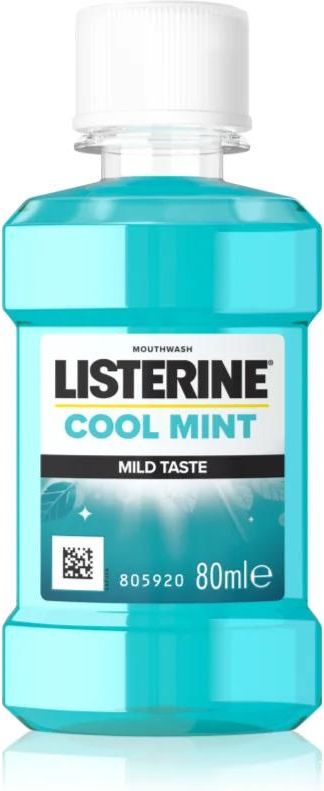 Listerine Cool Mint Mild Taste, 80 ml, Płyny do płukania unisex, Płyn do płukania jamy ustnej Listerine Cool Mint Mild Taste nie tylko odświeża oddech, ale jednocześnie walczy z osadem nazębnym i pomaga zachować zdrowe dziąsła i zęby. Właściwości: zapobiega rozwojowi próchnicy zębów niszczy bakterie ochrona przed nalotem na zębach zapewnia świeży oddech Sposób użycia: Po wyczyszczeniu zębów przepłucz usta płynem do płukania jamy ustnej przez tyle czasu, ile podano na opakowaniu, a potem wypluj.