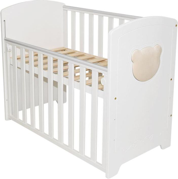 Łóżeczko z opuszczanym bokiem 100x50 "NOWY TOBI" 1. ŁÓŻECZKO NOWY TOBI Z TAPICEROWANYM MOTYWEM Proste, bezpieczne dwufunkcyjne łóżeczko wykonane drewna oraz płyty – może być stosowane jako łóżeczko wolnostojące lub dostawka! Do produkcji łóżeczka wykorzystano solidne materiały – zabezpieczone nietoksycznymi farbami i lakierami. Krotki boki pełne, wstawka tapicerownego misia, delikatne frezowania Długie boki łóżeczka również szczebelkowe posiadają osłonki tzn GRYZAKI zabezpieczające ramę łóżeczka przed pogryzieniem przez ząbki malucha. Ze względu na optymalny dystans pomiędzy szczebelkami łóżeczko pozwala na łatwe obserwowanie otoczenia przez dziecko, ale przy tym zabezpiecza przed zakleszczeniem się jego kończyn i główki. Łóżeczko posiada opuszczany bok, dlatego może być używane jako wolnostojące albo dostawka do łóżka rodziców. Dno z szerokimi szczebelkami – stanowi skuteczne podparcie dla materaca i dobrze przepuszcza powietrze. Łóżeczko przeznaczone do samodzielnego montażu – w zestawie komplet śrub. Wymiary łóżeczka: wewnątrz 100 x 50 cm na zewnątrz 104 x 56,50 cm wysokość w najwyższym punkcie 93 cm regulacja dna możliwa na 3 poziomach : 53 / 39 / 26.5cm