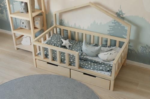 Wyjątkowe łóżko domek ANIKA zostało zaprojektowane aby spełniać marzenia naszych dzieci, wykonane z dbałością o każdy szczegół aby spełniać wymagania rodziców;) CECHY PRODUKTU: materiał : 100 % drewno sosnowe klasa 1 rozmiar - łóżko dostępne w kilku rozmiarach (chciałbyś zamówić łózko pod specjalny wymiar - napisz do nas) łóżko niemalowane (naturalne drewno szlifowane na gładko) szuflady na kółkach uchwyt w szufladach - lina nośność łóżka do 120 kg solidny, drewniany stelaż wykonany z listew sprężynujących w zestawie wszystkie szuflady mają głębokość 85 cm (z wyjątkiem łóżka o szer 70 cm - tu szuflady mają 75 cm) cena podstawowa nie obejmuje szuflad (szuflada / szuflady dostępne jest w wariancie do produktu) do wyboru 3 rodzaje szuflad: 2 szt z wycięciami / 2 szt z uchwytami sznurek / szuflada z funkcją spania standardowa wysokość nóg 20 cm max. wysokość materaca w dodatkowej szufladzie 12 cm DANE TECHNICZNE Materiał I Klasy Drewno Sosnowe Grubość kantówki 45x45 Wysokość barierek z poręczą 30 cm STRONA WEJŚCIA Łóżko z głównego zdjęcia ma wejście po prawej stronie (miejsce bez barierek)Stojąc przodem do łóżka (przed długą stroną z otworem) określamy po której stronie ma być wejście. Wejście może być po prawej, lewej stronie. WYMIARY ŁÓŻKA BEZ DACHU: WYMIAR WYMIAR ZEWNĘTRZNY (cm) SZEROKOŚĆ WEJŚCIA (cm) WYSOKOŚĆ CAŁKOWITA (cm) WYMIAR DODATKOWEGO SPANIA WYSOKOŚĆ NÓG (cm) 140x70 149 x 79 55 54 130x70 20 160x80 169 x 89 65 54 150x80 160x90 169 x 99 65 54 150x80 180x80 189 x 89 75 54 170x80 180x90 189 x 99 75 54 170x90 200x80 209 x 89 75 54 190x80 200x90 209 x 99 75 54 190x90