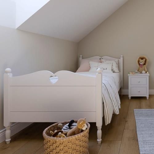 Łóżko LAURA charakteryzuje się oryginalnym designem i solidnym wykonaniem. Zostało wykonane z lakierowanej płyty MDF oraz płyty wiórowej. Solidna konstrukcja gwarantuje bezpieczeństwo i komfort użytkowania. WŁAŚCIWOŚCI: kolor :białe rzeźbione nogi wycięcia serca na szczytach maksymalny udźwig to ok 80 kg materace-w opcji (za dodatkowa opłatą) MATERIAŁ: szczyt wykonane z MDF lakierowanego pozostałe elementy z płyty MDF i płyty wiórowej laminowanej 1 stelaż : drewno sosnowe (przeważnie od 10 do 14 sztuk desek stelażowych ( sugerowany rozstawpowinien być co 5 cm)) łóżko lakierowane jest atestowanymi lakierami wodnymi Kolorystyka(odcień bieli)poszczególnych materiałów może się nieco różnić. WYMIARY: meble dostarczane są w paczkach z instrukcją do samodzielnego montażu oraz wszystkimi niezbędnymi okuciami. długość 204 cm szerokość 96 cm