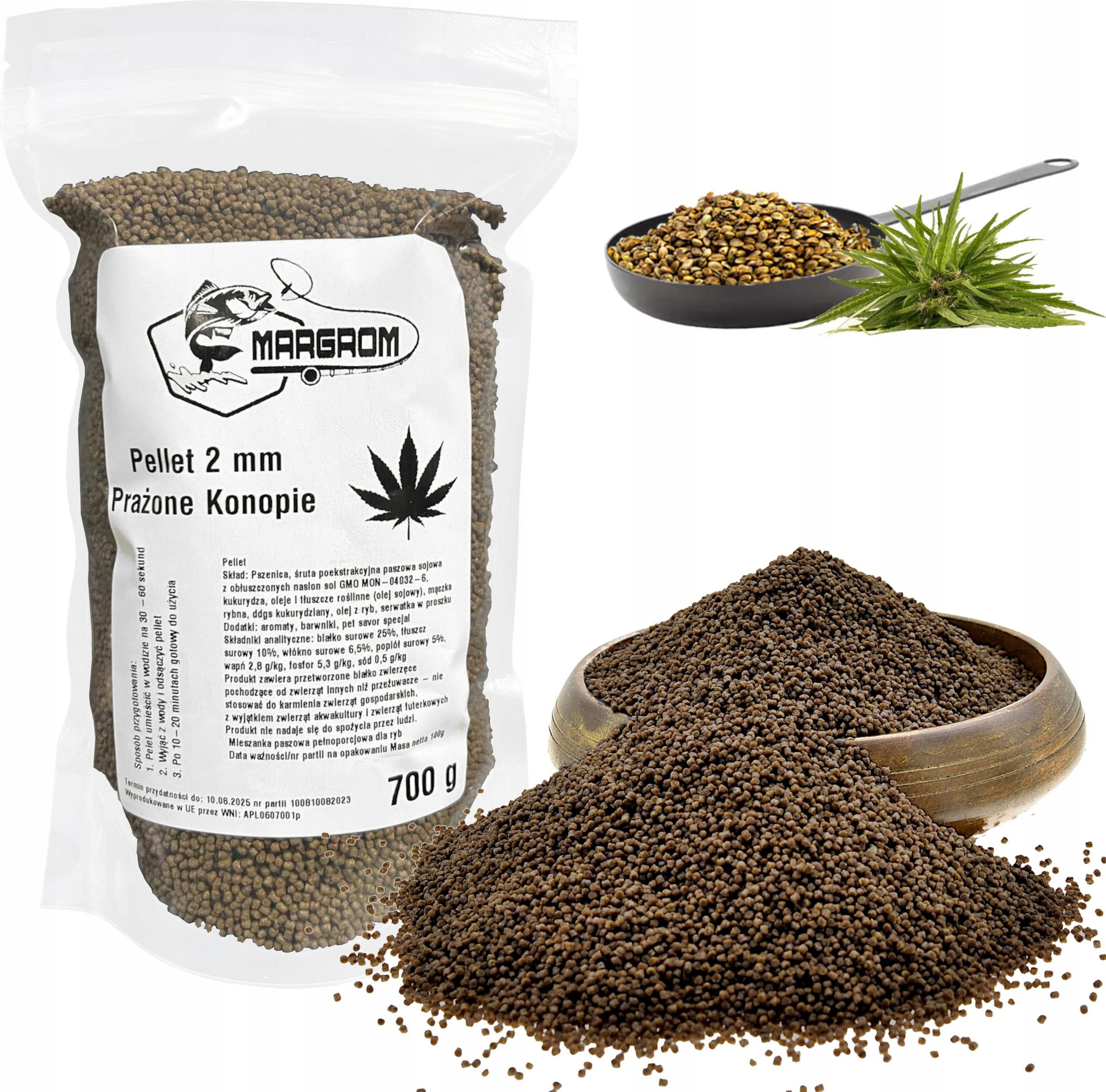 PELLET Zanętowy MARGROM 2mm/700g PRAŻONE KONOPIE Najwyższa pora na PELLET, który sprosta na prawdę wysoce wygórowanym wymaganiom wędkarzy, którego jakość, aromat, świetna praca w wodzie oraz wysoka skuteczność nie ma sobie równych - przekonajcie się sami!!! Produkowany metodą ekstruzji na najwyższej jakości mączkach rybnych, drobiowych, zbożach, ziarnach roślin oleistych, olejach: roślinnych oraz rybnych, hemoglobinie, wysokobiałkowych produktach roślinnych sprawia, że pellet Carp Method Ground charakteryzuje się bardzo wysoką wartością odżywczą i bardzo wysoką strawnością - a w połączeniu z najwyższej jakości aromatami i przyprawami sprawia, że żadna ryba nie pozostaje bez odzewu. Specyfikacje: Pellet zanętowy Średnica: 2 mm Aromat: PRAŻONE KONOPIE Idealny do łowienia: płoć, brzana, kleń, lin, jaź Waga netto: 700 g Produkt przeznaczony wyłącznie dla ryb. Pellet to atrakcyjna przynęta do łowienia karpi, leszczy, kleni, karasi i wszelkich innych ryb karpiowatych. Idealna zarówno na wody stojące, jak i płynące. Produkt polski - Made in Poland