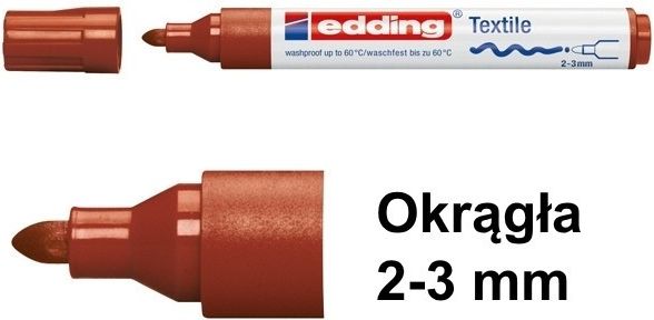 Brązowymarker tekstylny do ubrań - Edding 4500 ma okrągłą końcówkę, która pozwala na rysowanie linii o grubości od 2 do 3 mm. Pozwala z łatwością tworzyć piękne wzory na różnych tkaninach, takich jak bawełna i len. Tusz szybko schnie i można go prać w temperaturze do 60ºC.