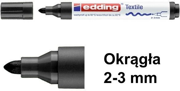 Czarnymarker tekstylny do ubrań - Edding 4500 ma okrągłą końcówkę, która pozwala na rysowanie linii o grubości od 2 do 3 mm. Pozwala z łatwością tworzyć piękne wzory na różnych tkaninach, takich jak bawełna i len. Tusz szybko schnie i można go prać w temperaturze do 60ºC.