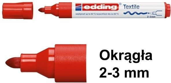 Czerwonymarker tekstylny do ubrań - Edding 4500 ma okrągłą końcówkę, która pozwala na rysowanie linii o grubości od 2 do 3 mm. Pozwala z łatwością tworzyć piękne wzory na różnych tkaninach, takich jak bawełna i len. Tusz szybko schnie i można go prać w temperaturze do 60ºC.