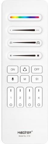 Pilot radiowy MiBoxer C10 SPI do sterowania kontrolerami LED MiBoxer do taśm adresowalnych LED biały Pilot C10 pozwala zdalnie sterować czterema strefami oświetlenia taśm cyfrowych LED. Komunikacja radiowa pilota z odbiornikami umożliwia płynne i bezproblemowe sterowanie kontrolerami SPI MiBoxer. Pilot wyposażony jest jest w przyciski manualne oraz dotykowe panele z suwakami. Sterowanie zachodzi drogą radiową, więc nie trzeba celować pilotem w stronę odbiornika. Biały pilot do LED MiBoxer C10 umożliwia sterowanie czterema oddzielnymi strefami oświetlenia na taśmach cyfrowych LED. Z jego pomocą ustawisz wymarzony kolor światła, zmienisz animację, wyregulujesz jasność oraz szerokość efektów na czterech zaprogramowanych przez siebie scenach – wszystko po to, aby Twoje wnętrze oddawało Twój charakter. Magnetyczny uchwyt pozwala zamocować pilot w praktycznie dowolnym miejscu w domu. Podstawowe funkcje pilota do LED MiBoxer C10: zmiana natężenia jasności światła w taśmie LED, zmiana koloru światła w taśmie adresowalnej LED, regulacja liczby pikseli i długości efektów świetlnych, wybór trybów dynamicznych (animacje, efekty świetlne), zapisywanie i przywoływanie do 4 scen świetlnych, włączanie i wyłączanie pilotem oświetlenia taśmami LED. Podstawowe parametry pilota C10: Zasilanie: 2 x bateria AAA, Tryb sterowania: przyciski manualne, dotykowy panel z suwakami, Liczba stref sterowania: 4, Komunikacja pilota z odbiornikami: radiowa, Częstotliwość komunikacji pilota z odbiornikami: 2.4 GHz, Zasięg komunikacji pilota: do 30 m w przestrzeni otwartej, Funkcje pilota: ściemnianie, rozjaśnianie, zmiana koloru, szerokości i liczby pikseli, Wymiary pilota (dł. x szer. x wys.): 140 mm x 45 mm x 18 mm.