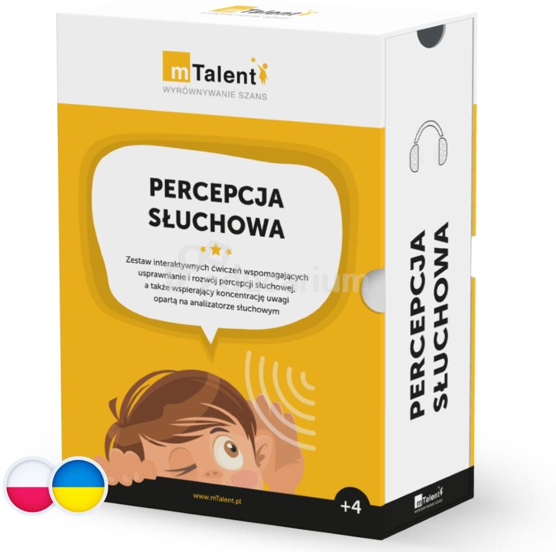 mTalent. Percepcja Słuchowa to: jedyny tego typu interaktywny produkt na rynku, odpowiedź na jedno z najczęstszych wskazań form pomocy psychologiczno-pedagogicznej i zaleceń do pracy z dzieckiem (kształtowanie i ćwiczenia percepcji słuchowej/wzrokowej), zbiór ponad 600 interaktywnych ekranów, materiał pozytywnie zaopiniowany i zrecenzowany, propozycja uzupełniona o zestaw dodatkowych pomocy i publikacji autorskich (np. pomoce tradycyjne, drukowalne karty, poradnik metodyczny), produkt zgodny z wytycznymi dostępności dla osób z niepełnosprawnościami. W programie wydzielono następujące działy: Rozpoznawanie i różnicowanie dźwięków Sekwencje i rytmy Słuch fonemowy Synteza słuchowa Analiza słuchowa Pamięć słuchowa i polecenia złożone Rymy i zagadki Zabawy słuchowe (zawierające ćwiczenia niesklasyfikowane w innych działach, np. koordynacja słuchowo-ruchowa itd.) Propozycja uzupełniona została o zestaw dodatkowych materiałów i publikacji autorskich rozszerzających spektrum możliwości zastosowania tego produktu (np. pomoce tradycyjne, drukowalne karty, poradnik metodyczny). Program przeznaczony jest do pracy przy użyciu komputera, tabletu, smartfona, oraz tablicy lub monitora interaktywnego (na systemach Windows, Android oraz iOS). Niewątpliwą zaletą programu jest fakt, iż można pracować zarówno będąc online (na dowolnym urządzeniu z każdego dowolnego miejsca) jak i offline (na komputerze w szkole lub gabinecie)