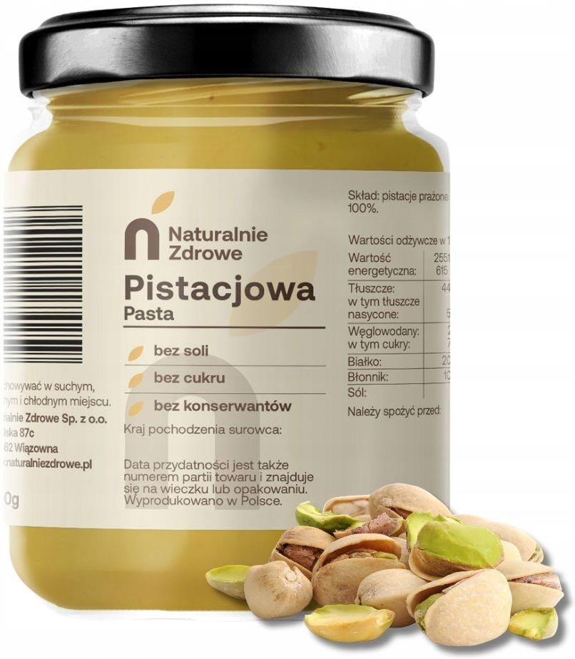 Pasta Pistacjowa Bez Dodatków Naturalna 500g Stworzona z najwyższej jakości pistacji, ta pasta zachwyca nie tylko swoim bogatym, głębokim smakiem, ale także swoją czystością i naturalnością. Nasza pasta jest stworzona wyłącznie z orzechów pistacjowych - żadnych sztucznych dodatków, konserwantów czy barwników. Dzięki temu możesz cieszyć się smakiem prawdziwych pistacji w ich najczystszej formie, bez zbędnych dodatków. Zaskocz swoich gości wyjątkowym smakiem, dodając pastę pistacjową do wypieków, deserów, czy nawet do smakowitych sosów do makaronu. Jej kremowa konsystencja sprawia, że jest idealna do smarowania na grzanki, tosty czy dodawania do kanapek. Każda porcja tej pasty to wyjątkowy wyciąg z natury - bogaty w zdrowe tłuszcze, białko i wartości odżywcze, które dodadzą energii Twoim codziennym daniom. Tabela wartości odżywczych Wartość energetyczna 2551 kJ / 615 kcal Tłuszcze 44,4 g w tym tłuszcze nasycone 5,4 g Węglowodany 28 g w tym cukry 7,6 g Białko 20,6 g Błonnik 10,3 g Sól 1 g Skład: pistacja prażona 100% W zakładzie wykorzystywane są surowce zawierające: gluten, sezam, różne orzechy. Data przydatności i numer partii towaru znajdują się na opakowaniu. Przechowywać szczelnie zamknięte w suchym i chłodnym miejscu. Opakowanie może różnić się wyglądem w zależności od partii towaru. Producent: Naturalnie Zdrowe Sp. z o.o. Dlaczego Naturalnie Zdrowe to Twój najlepszy wybór? Kupujesz bezpośrednio od producenta: Jesteśmy obecni na każdym etapie produkcji, co gwarantuje świeżość i najwyższą jakość naszych produktów. Dekada zaufania: Od 10 lat inspirujemy naszych klientów do dbania o zdrową dietę, dostarczając im naturalne i nieprzetworzone produkty. Autorskie receptury: Oferujemy m.in. opracowane przez nas mieszanki do wypieku chleba, pizzy czy gofrów, które w łatwy sposób przygotujesz w domu. Produkty godne zaufania: Aż 3 nasze produkty zostały nagrodzone w plebiscycie Influencer’s Top 2024. Nasze pasty produkowane są z naturalnych surowców. W związku z tym ich kolor, smak i konsystencja mogą różnić się w zależności od partii produktu. Te naturalne różnice nie wpływają na jakość ani wartości odżywcze past.
