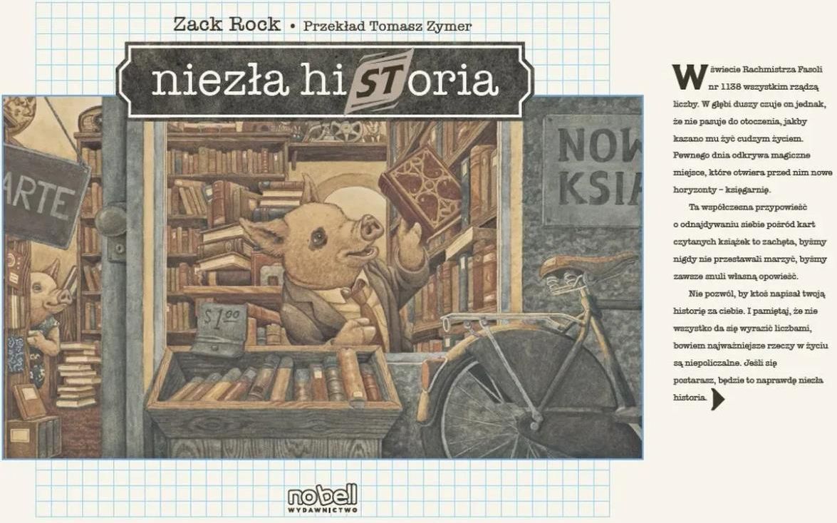 Niezła historia No Bell ✅ ✔️ Czy kiedykolwiek czułeś się, jakbyś żył życiem kogoś innego? Wydawało ci się, jakbyś była nie na miejscu? W świecie Rachmistrza Fasoli (nr 1138) wszystkim rządzą liczby, ale on w głębi duszy czuje, że jest kimś więcej niż tylko księgowym. Szczęśliwie pewnego dnia odkrywa magiczne miejsce, które otwiera przed nim nowe horyzonty – księgarnię. Ta współczesna przypowieść o odnajdywaniu siebie pośród kart czytanych książek to zachęta, byśmy nigdy nie przestawali marzyć i odważnie snuli własną opowieść. Cieszymy się, że wydaliśmy w No Bell Niezłą historię, bo wiemy, że czytane przez nas książki – jak te odkryte przez Rachmistrza Fasolę o nim – niejednokrotnie mówią coś przede wszystkim właśnie o nas i jest to wspaniałe. Informacje o autorze tekstu i ilustracji: Zack Rock jest amerykańskim pisarzem i ilustratorem, absolwentem Akademii Sztuki w Cambridge w dziedzinie tworzenia ilustracji dla dzieci. Jego prace pojawiają się w wielu magazynach, prasie codziennej i komiksach, na okładkach albumów oraz w grach komputerowych. Jest laureatem prestiżowej nagrody Folio Book Illustration Award (2024). Jego prace były publikowane w renomowanych czasopismach, takich jak Communication Arts, 3x3, Spectrum, American Illustration, ImagineFX, a także podczas Targów Książki Dziecięcej w Bolonii. Mieszka w Berlinie. ➡️ ISBN: 978-83-67823-17-3 Data premiery: 2025-04-09 Autor: Zack Rock Tłumacz: Tomasz Zymer Wydawnictwo: No Bell Rok wydania: 2025 Oprawa: Twarda Liczba stron: 32 Wydanie: 1 Rodzaj: Książki Głębokość: 10.000000 Kategoria wiekowa: 7+ Dodatkowe informacje. Niezła historia ✅ No Bell ✅ Numer: 9788367823173, PLA-30859925. ✅ Ilośc dzni do wysyłki:2. ✅ Waga: W opisie kg. ul> ➡️ Książki dla dzieci\Literatura ➡️ Niezła historia to gwarancja doskonałej jakości i niezawodności, zaprojektowana z myślą o najbardziej wymagających użytkownikach. ➡️ Innowacyjne technologie i perfekcyjne wykonanie sprawiają, że produkt wyznacza nowe standardy na rynku. ➡️ Każdy element został starannie dopracowany, aby zapewnić maksymalną wygodę, trwałość i satysfakcję z użytkowania. ➡️ Wybierając Niezła historia, inwestujesz w produkt, który spełni najwyższe oczekiwania i sprawdzi się w każdej sytuacji.