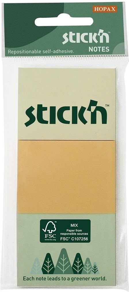 Notes samoprzylepny FSC 38x51mm 3 kolory pastelowe po 100 kartek STICKN ✅ ✔️ Papierowe notesy samoprzylepne wyprodukowane z drewna pozyskanego w ramach zrównoważonej gospodarki leśnej. Posiadają certyfikat FSC 107256. Idealne do robienia notatek i zostawiania ważnych wiadomości. 3 notesy 38 x 52 mm …