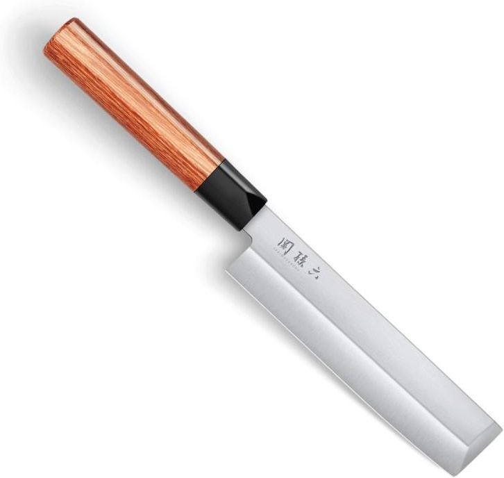 KAI - Nóż Usuba 17 cm Seki Magoroku Red Japońska firma KAI to synonim wysokiej jakości, wyroby z logo tej marki w swojej ojczyźnie mają status kultowych produktów. Poza uznaniem w Japonii, są one rozpoznawalne na całym świecie. Firma założona w 1908 roku, w mieście Seki rozwija się i sprzedaje wysokiej klasy noże i produkty pochodne, które charakteryzuje niezwykła ostrość i funkcjonalność. Jedną z serii noży jest linia SEKI Magoroku, która wyróżnia się tradycyjnymi jednostronnie ostrzonymi kształtami ostrzy, a także nożami z ostrzami na styl europejski - dwustronnie ostrzonymi. Ostrza jednostronne są doskonałe podczas przygotowania dań w stylu japońskim, np. sushi, do którego potrzebne są bardzo precyzyjne cięcia. Natomiast ostrza dwustronne oferują łatwość obsługi i wszechstronność. Wszystkie ostrza w serii SEKI Magoroku Redwood są wykonane z japońskiej polerowanej stali, wzbogacanej w węgiel i osiągają twardość 58 HRC. Rękojeść noży o tradycyjnym kasztanowym kształcie wykonana jest z drewna pakka. Wysokiej jakości żywice, którymi wzbogacone jest drewno, czynią materiał bardziej sprężysty oraz zwiększają jego odporność na wilgoć. Rękojeść zwęża się w kierunku ostrza i wygodnie leży w dłoni. Polerowane ostrze w zestawieniu z czerwonym uchwytem w tradycyjnym japońskim stylu, nadaje nożom z serii Magoroku atrakcyjnego wyglądu, poza walorami praktycznymi noże będą ozdobą każdej kuchni. Prezentowany nóż posiada jednostronne ostrze o długości 17 cm, typu USUBA - tradycyjne japońskie ostrze do obróbki warzyw (z japońskiego cienkie ostrze ). Nóż z ostrzem tego typu jest idealny podczas krojenia warzyw, sałaty oraz siekania. Krojenie z jego pomocą przebiega szybko, a przygotowanie warzyw do przyrządzenia warzyw na Stir-fry zajmie tylko chwilę.