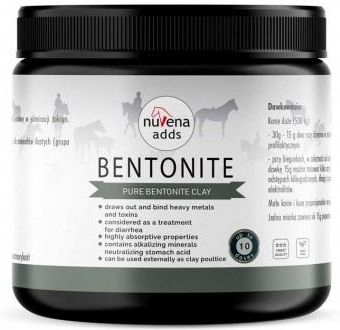 Podstawowym składnikiem bentonitu jest montmorylonit, czyli minerał z gromady krzemianów zaliczany do minerałów ilastych (grupa smektytów). Ma on właściwości wiążące toksyny, dostarcza także minerały. Kiedy stosować? przy skarmianiu słabej jakości pasz gdy podawane jest siano złej jakości u koni z biegunką wiążąc toksyny odciąża wątrobę Działanie Bentonitu: Przeciwbiegunkowe - ma zdolność do pochłaniania wody. Wiążąc wodę pęcznieje i jednocześnie chłonie niektóre toksyny znajdujące się w przewodzie pokarmowym, co ma duże znacznie w przypadku biegunek tła toksycznego. Uwodniony montmorylonit może zwiększyć swą objętość nawet kilkukrotnie. Wydzielanie nadmiernych ilości płynów przez ścianę przewodu pokarmowego jest jednym z mechanizmów powstawania biegunki, stąd zastosowanie bentonitu może złagodzić jej przebieg. Wiążące toksyny - posiada silny ładunek ujemny, dlatego przyciąga do siebie wiele toksyn o ładunku dodatnim. Przy zetknięciu z toksynami lub metalami ciężkimi absorbuje je, uwalniając jednocześnie do organizmu zawarte w nim minerały. Szczególnie często występujące w środowisku koni są mikotoksyny. Znajdują się w sianie lub zbożach. Bentonit dzięki swojej unikatowej strukturze wiąże takie mykotoksyny jak: aflatoksyny, deoksyniwalenol, zearalenon, a także kontroluje zanieczyszczenia radionuklidami. Mikotoksyny to metabolity grzybów toksynotwórczych, potocznie nazywane pleśniami. Występują nie tylko w paszach, ale również w ściółce. Ich spożycie wywołuje tak zwane mikotoksykozy, czyli choroby specyficznie objawiające się u zwierząt gospodarskich np. uszkodzenia wątroby, uszkodzenia nerek, biegunki, problemy oddechowe. Mikotoksyny cechuje również działanie niespecyficzne, które objawia się zmniejszeniem wykorzystania paszy i ogólnym pogorszeniem samopoczucia i zdrowia. Badania wykazały, że duży wpływ na obecność i stężenie toksyn grzybów mikroskopowych w sianie mają warunki przechowywania, w szczególności wilgoć. Obniżenie pH kwasów żołądkowych - przez dużą zawartość wapnia, odczyn zasadowy bentonit będzie zmniejszał kwasowość soków trawiennych co może okazać się korzystne dla koni mających skłonność do powstawania wrzodów żołądka. Zastosowanie zewnętrzne – bentonit rozrobiony w wodzie tworzy glinkę, którą można stosować jako okład na otarcia, ropnie, oparzenia, ukąszenia, kopyta i inne zewnętrzne rany. Przyspiesza gojenie i łagodzi odczyn zapalny. Świetnie sprawdzi się jako okład na zmianach alergicznych, gdyż zmniejsza swędzenie i obrzęk po ukąszeniu owadów lub w wyniku podrażnienia alergicznego. Skład Naturalny bentonit wapniowy - montmorylonit Sposób użycia dla dużych koni (500kg)* - 15 do 30 g dwa razy dziennie w stosowaniu profilaktycznym - przy biegunkach, w zależności od nasilenia objawów, dawkę 15g można stosować kilka razy dziennie w odstępach kilkugodzinnych, dbając o podaż wody i elektrolitów. *Małe konie i kuce proporcjonalnie mniej. Jedna miarka zawiera ok 15g preparatu. Stosowanie zewnętrzne jako okład na otarcia, ropnie, oparzenia, ukąszenia, kopyta i inne zewnętrzne rany. Przyspiesza gojenie i łagodzi odczyn zapalny. jako okład na zmiany alergiczne, np. miejsca swędzące (rzep ogona, brzuch, klatka piersiowa, grzywa), a także obrzęk po ukąszeniu owadów może być nakładana w postaci glinki na ścięgna po treningach Sposób przygotowania Dodawać do paszy. Może być zwilżona bezpośrednio przed podaniem. Nie podawać jednorazowo więcej niż 15 g. Glinka nie powinna mieć kontaktu z metalem, bo wtedy traci większość swoich właściwości. Do mieszania nie należy używać metalowych przedmiotów. Przechowywać w suchym i chłodnym miejscu. Po użyciu szczelnie zamknąć. Waga netto: 300g O marce NuVena NuVena Adds to seria suplementów dla koni, głównie jednoskładnikowych. Przy zachowaniu najwyższych standardów produkcyjnych oraz wysokiej jakości surowców mamy przyjemność zaproponować Państwu produkty o bardzo atrakcyjnej cenie. Właścicielem marki NuVena jest firma Nuba Equi - w 100% Polski producent pasz i suplementów dla koni.