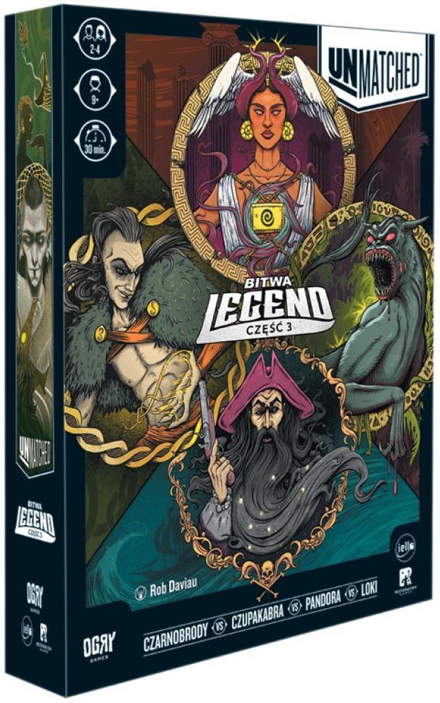 Unmatched: Bitwa Legend 3 Nie ma równych na polu walki! Unmatched to gra figurkowa o pojedynkach postaci z różnych krain i epok, od herosów znanych z mitów i legend, do bohaterów książek i filmów. Każdy z nich dysponuje własną talią kart, która wyraża jego wyjątkowy styl walki. Możesz mieszać i zestawiać bohaterów z dowolnych zestawów Unmatched, ale pamiętaj: ostatecznie zwyciężyć może tylko jeden! Bohaterowie dostępni w tym zestawie: Czarnobrody - charyzmatyczny i przerażający pirat, Loki - nordycki bóg psotników, Pandora - zesłana przez bogów na ziemię z puszką pełną nieszczęść, Czupakabra - legendarny "wysysacz kóz", bezwzględny zabójca. Zawartość: 4 figurki bohaterów 4 żetony pomocników 4 wskaźniki zdrowia 133 karty dwustronna plansza 3 żetony dublonów żeton skrzyni instrukcja