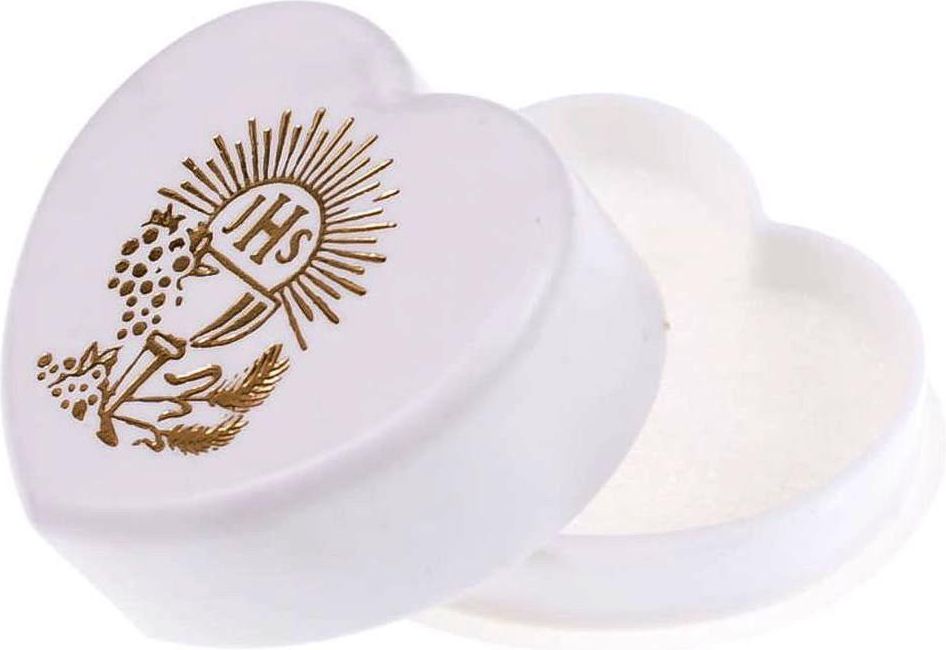 PUDEŁKO ETUI NA RÓŻANIEC BIAŁE SERCE IHS Pudełeczko, etui plastikowe na różaniec. Kolor biały, nadruk złoty. Wymiary: 50 x 47 x 20 mm