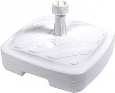 Biała podstawa parasola z wytrzymałego tworzywa sztucznego, odpowiednia dla parasolki o średnicy czaszy od 135cm do 180cm. wyjmowany trzpień z regulacją dociśnięcia rurki parasola, otwór z zatyczką do wsypania piasku lub nalania wody w celu obciążenia podstawy, tworzywo odporne na warunki atmosferyczne, szerokość 40 cm, głębokość 40 cm, wysokość 10 cm, polski producent. Nr oferty xSale POD803890