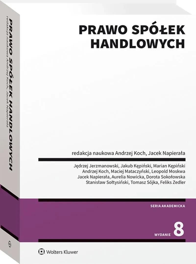 Redaktorzy naukowi: Andrzej Koch, Jacek Napierała Autorzy: Jędrzej Jerzmanowski, Marian Kępiński, Jakub Kępiński, Maciej Mataczyński, Leopold Antoni Moskwa, , Aurelia Nowicka, Tomasz Sójka, Dorota Sokołowska, Stanisław Sołtysiński, Feliks Zedler Podręcznik przedstawia kompleksową analizę zagadnień dotyczących tworzenia, organizacji, funkcjonowania i reprezentacji wszystkich typów spółek uregulowanych w ustawie – Kodeks spółek handlowych. Wskazano w nim również na regulacje innych aktów prawnych, istotnych z punktu widzenia omawianej tematyki, m.in. ustawy o Krajowym Rejestrze Sądowym oraz niektórych przepisów Kodeksu cywilnego. W szczególności omówiono takie zagadnienia jak: • prokura, firma i przedsiębiorstwo spółki; • zagadnienia kolizyjnoprawne dotyczące spółek; • nowy typ spółki kapitałowej – prostą spółkę akcyjną; • sposoby łączenia, podziału, przekształcenia i likwidacji spółek; • prawo spółek Unii Europejskiej. Autorzy są wykładowcami na Wydziale Prawa i Administracji UAM w Poznaniu. Większość z nich prowadzi także działalność zawodową jako adwokaci bądź radcowie prawni. Książka jest przeznaczona dla przedstawicieli zawodów prawniczych – adwokatów, radców prawnych, sędziów oraz dla przedsiębiorców. Zainteresuje również pracowników naukowych i studentów.