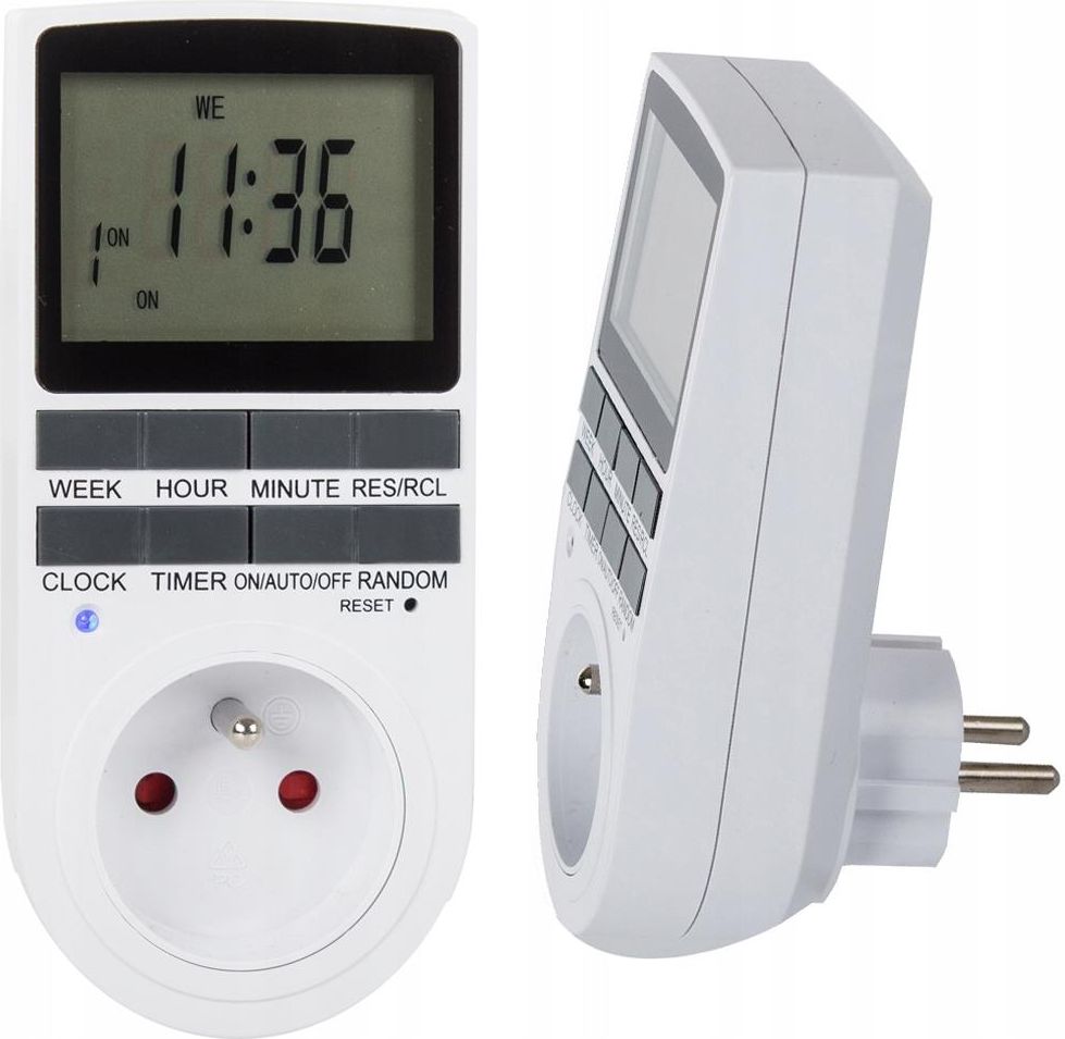 PROGRAMATOR CZASOWY WYŁĄCZNIK WŁĄCZNIK LCD CYFROWY Wyłącznik czasowy przeznaczony jest do sterowania zasilaniem urządzeń domowych. Posiada wbudowaną baterię do obsługi zegara. Włącznik czasowy można wykorzystać do automatycznego czasowego włączania i wyłączania różnych urządzeń, sterowania ogrzewaniem elektrycznym i oświetleniem pomieszczeń oraz symulacji obecności w domu. Zastosowanie urządzenia pozwala na oszczędzanie energii elektrycznej. Wyłącznik czasowy wyposażony jest w duży, czytelny wyłącznik LCD. Przed pierwszym użyciem, umieść urządzenie w gniazdku na około 5-10 minut bez obciążenia, aby urządzenie mogło się naładować. W tym czasie programator może nie pokazywać żadnych danych na wyświetlaczu i jest to pełni normalne. Taka sytuacja może również mieć miejsce po długim okresie nieużywania urządzenia. Alternatywny system 12/24 godzinny. Łatwe przełączanie między czasem zimowym i letnim (SUMMER). USTAWIENIA POCZĄTKOWE: Użyć spinacza do papieru nacisnąć przycisk RESET (usuwa wszystkie ustawienia) Wyświetlacz LCD wyświetli informację: Rysunek 1 - automatycznie przejdzie do „Trybu zegara”, Rysunek 2 - możesz przejść do następnego kroku. USTAWIENIA ZEGARA: Pokazuje dzień, godzinę, i minuty ✅ Aby ustawić dzień, naciśnij jednocześnie przyciski „CLOCK” i „ WEEK" ✅ Aby ustawić godzinę, naciśnij jednocześnie przyciski „CLOCK” i „HOUR” ✅ Aby ustawić minuty, naciśnij jednocześnie przyciski „CLOCK” i „MINUTE" ✅ Aby przełączyć się między trybem 12-godzinnym/24-godzinnym, naciśnij jednocześnie „CLOCK” i „TIMER” ✅ Zmiana czasu z zimowego na letni: należy wcisnąć przycisk " CLOCK" oraz przycisk „ON/AUTO/OFF”, na wyświetlaczu pojawi się napis "SUMMER" (lato). USTAWIENIE TRYBU PRACY: ✅ ON- zawsze włączony ✅ OFF - zawsze wyłączony ✅ AUTO - automatyczne włączanie/ wyłączanie Wcisnąć przycisk ON/AUTO/OFF, aby ustawić jeden z trzech trybów. TRYB USTAWIEŃ: Nacisnąć przycisk TIMER aby wejść w tryb ustawień czasowych. Wcisnąć przycisk WEEK (tydzień) aby wybrać grupę dni, w których chcemy włączyć urządzenie. Można wybrać następujące opcje: PON WT ŚR CZW PT SO NI (MO TU WE TH FR SA SU), PON WT ŚR CZW PT (MO TU WE TH FR), SO NI (SA SU), PON WT ŚR CZW PT SO (MO TU WE TH FR SA), PON, ŚR, PT (MO WE FR), WT CZW SO (TU TH SA), PON WT ŚR (MO TU WE), CZW PT SO (TH FR SA), PON ŚR PT NI (MO WE FR SU) lub opcja wyboru pojedyńczych dni tygodnia. Przykładowe ustawienie timera. Aby urządzenie włączało się codziennie o godzinie 18:15 a wyłączało o 22:15 a) Wcisnąć przycisk TIMER na wyświetlaczu pojawi się 1_ON b) Wcisnąć przycisk WEEK aż na wyświetlaczu pojawi się " MO TU WE TH FR SA SU" c) Wcisnąć przycisk HOUR aż na wyświetlaczu pojawi się 18:15 lub 6:15PM d) Wcisnąć przycisk MINUTE aż na wyświetlaczu pojawi się 18:15 lub 6:15PM e) Wcisnąć ponownie TIMER , na wyświetlaczu pojawi się 1_OFF Powtórzyć punkty c oraz d, aż do wyświetlenia się 22:15 lub 10:15PM Wciśnięcie przycisku RES/RCL spowoduje zatrzymanie programu, ponowne wciśnięcie RES/RCL - uruchomi program FUNKCJA LOSOWA: Naciśnij przycisk „RANDOM”, wyświetlacz LCD wyświetli „RANDOM”, wskazując, że obowiązuje od 18:00 do 6:00. Aby anulować funkcję RANDOM, wystarczy ponownie nacisnąć przycisk „RANDOM”, a wskaźnik „RANDOM” zniknie. SPECYFIKACJA TECHNICZNA: ✅ Kod produktu: 11295 ✅ Wysoka jakość wykonania ✅ Napięcie: 230V~/50Hz ✅ Warunki pracy: max 16A, 230V~, 50Hz, 3680W ✅ Dokładność: +/- 1 minuta/miesiąc ✅ Duży wyświetlacz LCD ✅ Podtrzymanie pamięci ✅ Kolor: biały ✅ Certyfikat CE WYMIARY: ✅ Długość całkowita: 13cm ✅ Głębokość bez wtyczki: 4cm ✅ Głębokość z wtyczką: 8cm ✅ Wielkość wyświetlacza: 5cm x 3,5cm ZESTAW ZAWIERA: ☑️ Fabrycznie nowy wyłacznik czasowy. ☑️ Oryginalne opakowanie