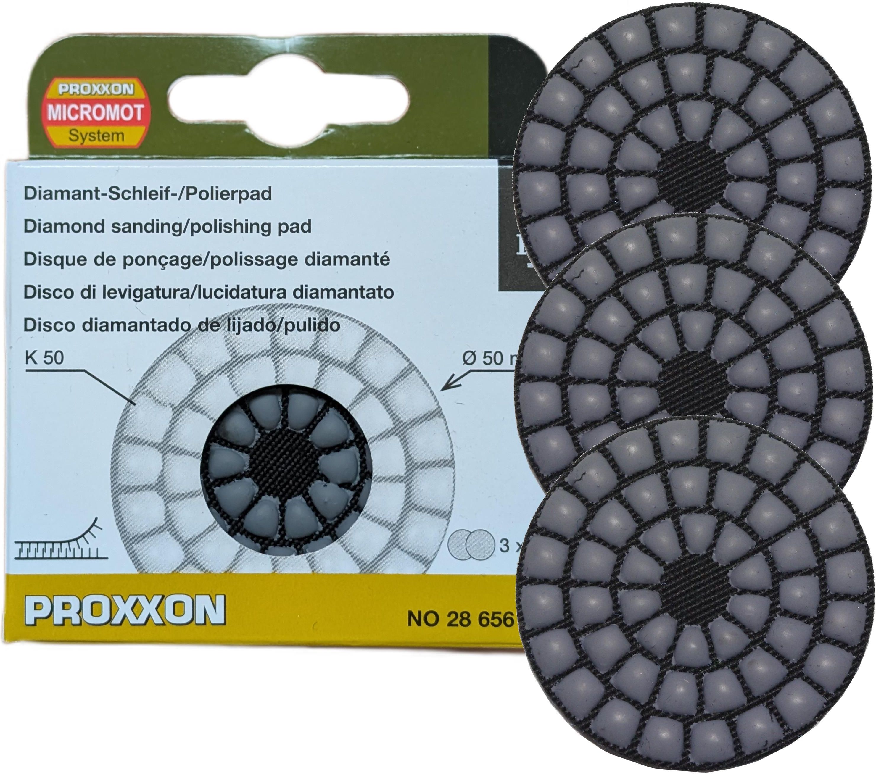 PROXXON 28656 TARCZA SZLIFIERSKO-POLERUJĄCA DO POLEREK WP/E I WP/A P50 3szt. PR28656 Opis tarczy szlifiersko-polerującej Proxxon Diamentowe tarcze szlifiersko-polerujące Proxxon przeznaczone do pracy z polerkami kątowymi WP/E i WP/A. Idealne do fazowania oraz szlifowania i polerowania krawędzi w …