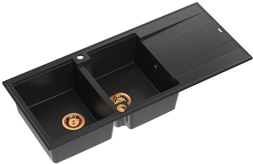 Quadron Zlewozmywak Dwukomorowy EVAN 121 Granitowy z Syfonem P2O i Ociekaczem Wymiary: 116 x 50 cm Kolor: Czarny / Pure Carbon + Miedź PVD Zestaw wyposażony jest w: zlewozmywak granitowy 116 x 50 cm syfon PUSH-TO-OPEN z możliwością podłączenia zmywarki lub pralki z przyściennym systemem SAVE SPACE, …