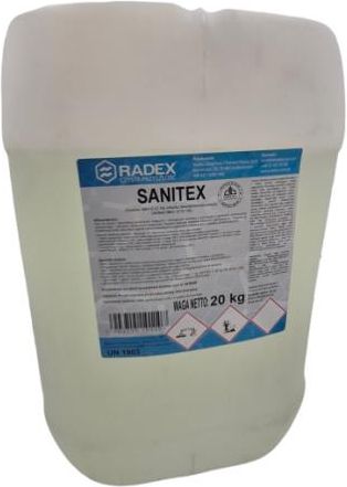 Płyn do mycia i dezynfekcji powierzchni kontaktujących się z żywnością w zakładach przetwórstwa spożywczego. SANITEX jest pianowym produktem myjąco-dezynfekującym o lekkim odczynie zasadowym, przeznaczonym do zastosowania w zakładach przemysłu spożywczego i obszarze użyteczności publicznej, oraz konserwacji wody i płynów w systemach chłodniczych. Jako substancję czynną zawiera: alkil (C12-16)-chlorku dimetylobenzyloamonu (ADBAC/BKC (C12-16)): CAS: 68424-85-1, WE: 270-325-2 [zaw. 5g/100g]. Opakowanie: 20 kg. Zalecane stężenia roztworów roboczych, ich właściwości biobójcze oraz czas kontaktu: 1. Sektor spożywczy i użyteczności publicznej (powierzchnie mające i niemające kontaktu z żywnością): bakteriobójcze: stężenie 6,0%, czas kontaktu 5 min. w temp. 20°C (6kg preparatu SANITEX rozpuścić w 94 litrach (kg) wody). grzybobójcze: stężenie 5,0%, czas kontaktu 15 min. w temp. 20°C (5kg preparatu SANITEX rozpuścić w 95 litrach (kg) wody). 2. Konserwacja wody i innych płynów w systemach chłodniczych: bakteriobójcze - stężenie 1%: czas kontaktu 3 i 24 godzin, dla temperatury 25°C. ZASTOSOWANIE: Mycie i dezynfekcja powierzchni mających i niemający kontaktu z żywnością m.in: ścian, posadzek, maszyn, urządzeń; Mycie i dezynfekcja aparatów, urządzeń i powierzchni produkcyjnych metodą pianową; Mycie i dezynfekcja aparatów, urządzeń i powierzchni produkcyjnych metodą ręczną; Mycie i dezynfekcja powierzchni wykonanych z metali i tworzywa sztucznego; Preparat do konserwacji wody i innych płynów wykorzystywanych w systemach chłodniczych.
