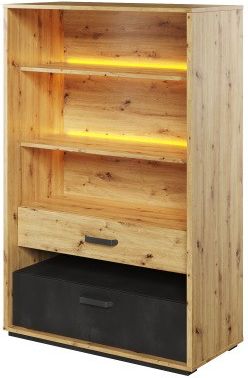 Funkcjonalne Przechowywanie i Ekspozycja Regał Qubic to średniej wysokości mebel, który zapewnia funkcjonalne rozwiązanie do przechowywania różnych przedmiotów. Wyposażony w trzy wysokie półki, umożliwia wygodne przechowywanie książek, akcesoriów szkolnych oraz innych drobiazgów. Dwie szuflady, umieszczone między półkami, oferują dodatkową przestrzeń na mniejsze przedmioty. Półka-wnęka pomiędzy szufladami to idealne miejsce na podręczne akcesoria, które zawsze warto mieć pod ręką. Nowoczesny i Geometryczny Design Regał Qubic wyróżnia się nowoczesnym, geometrycznym designem, który przyciąga wzrok i dodaje wnętrzu wyjątkowego charakteru. Oryginalnie wsunięte fronty, oraz połączenie kolorów – dekory o barwie drewna i surowa stal – tworzą unikalny kubistyczny patchwork. Kształtne, metalowe uchwyty oraz niewysokie podpory podkreślają nowoczesny styl mebla, czyniąc go doskonałym wyborem do pokoju młodzieżowego. Dzięki takiemu designowi, regał nie tylko spełnia funkcję praktyczną, ale również dekoracyjną. Trwałość i Dodatkowe Oświetlenie Regał Qubic wykonany jest z wytrzymałej płyty laminowanej, wykończonej trwałym obrzeżem ABS, co zapewnia jego długą żywotność i odporność na uszkodzenia. Mebel wymaga samodzielnego montażu, co ułatwia jego transport i dostosowanie do indywidualnych potrzeb użytkownika. Dodatkowym atutem jest oświetlenie LED w komplecie, które podkreśla nowoczesny wygląd regału i ułatwia korzystanie z niego w ciemniejszych pomieszczeniach. Solidna konstrukcja i estetyczne wykończenie czynią regał Qubic idealnym wyborem dla każdego, kto ceni połączenie funkcjonalności z nowoczesnym designem. Usługa wniesienia z montażem Oferujemy możliwość zakupu mebli z dodatkową usługą wniesienia oraz montażu.Po wybraniu jednej z opcji i złożeniu zamówienia, klient otrzyma wycenę oraz potwierdzenie realizacji usługi.