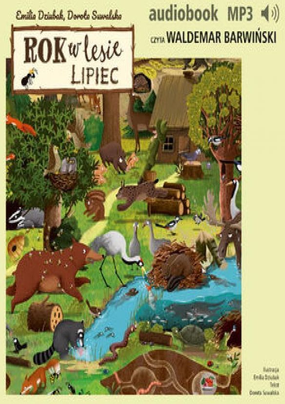 Bestsellerowa książka Emilii Dziubak teraz także do słuchania – z odgłosami lasu i wyjątkowym narratorem! W lipcowym lesie dużo się dzieje. Żółw błotny wygrzewa się na słońcu, młode lisy szukają miejsc na własne nory, wydry z zapałem trenują pływanie, a dzięcioły, sroki i słowiki zaczynają lekcje latania… „Rok w lesie. Lipiec” to siódmy odcinek z cyklu dwunastu opowieści stworzonych przez Dorotę Suwalską na podstawie bestsellerowej książki Emilii Dziubak. Podczas słuchania historii opowiadanych przez wyjątkowego narratora – jest nim dąb, któremu głosu użyczył Waldemar Barwiński – możesz uważnie oglądać „Rok w lesie”, bo teksty audiobooka idealnie pasują do ilustracji. W nagraniu usłyszysz też realistyczne odgłosy zwierząt, które przeniosą cię w sam środek letniego lasu. Pozwól, by las opowiedział ci o tym, co dzieje się w lipcu między drzewami. Słuchaj w domu, w przedszkolu, w podróży lub przed snem. Dorota Suwalska – pisarka, animatorka kultury, ilustratorka, dziennikarka, autorka scenariuszy. Nominowana do Astrid Lindgren Memorial Award 2013 i 2014. Współpracowała z TVP, realizując krótkie filmy plastyczne i felietony autorskie dla dzieci. W swoim dorobku ma trzy tomiki poetyckie oraz powieści dla dzieci i młodzieży: „Znowu kręcisz, Zuźka!", „Zuźka w necie i w realu", „Bruno i siostry" (wyróżnienie literackie w konkursie Polskiej Sekcji IBBY Książka Roku, nominacja do nagrody Kornela Makuszyńskiego, powieść na liście książek proponowanych przez Polski Instytut Książki), „Marionetki Baby-Jagi", „Ratunku, marzenia!", „Pan Fortepianek". Jej utwory tłumaczone były na hiszpański, słoweński, a także... na język przestrzeni. To ostatnie dotyczy literacko-internetowego projektu: „a" (dla dorosłych). Swoje wiersze, opowiadania i artykuły publikowała w prasie dziecięcej, literackiej i pedagogicznej, podręcznikach szkolnych. Współpracuje z portalem Emilia Dziubak – autorka i ilustratorka książek dla dzieci. Absolwentka Akademii Sztuk Pięknych w Poznaniu. Współpracuje z autorami i wydawnictwami w Polsce i za granicą. Laureatka Nagrody Literackiej . Warszawy w 2014 r. Laureatka nagrody „Przecinek i Kropka” w konkursie na najlepszą książkę dziecięcą w 2016 r. Wyróżniona w 2016 r. w konkursie PTWK Najpiękniejsze Książki Roku 2015 za autorską książkę „Rok w lesie”. Laureatka nagrody „Żółta Ciżemka” w 2017 r. W 2018 r. wyróżniona w konkursie Książka Roku Polskiej Sekcji IBBY. Laureatka nagrody Soligatto 2019. Powyższy opis pochodzi od wydawcy